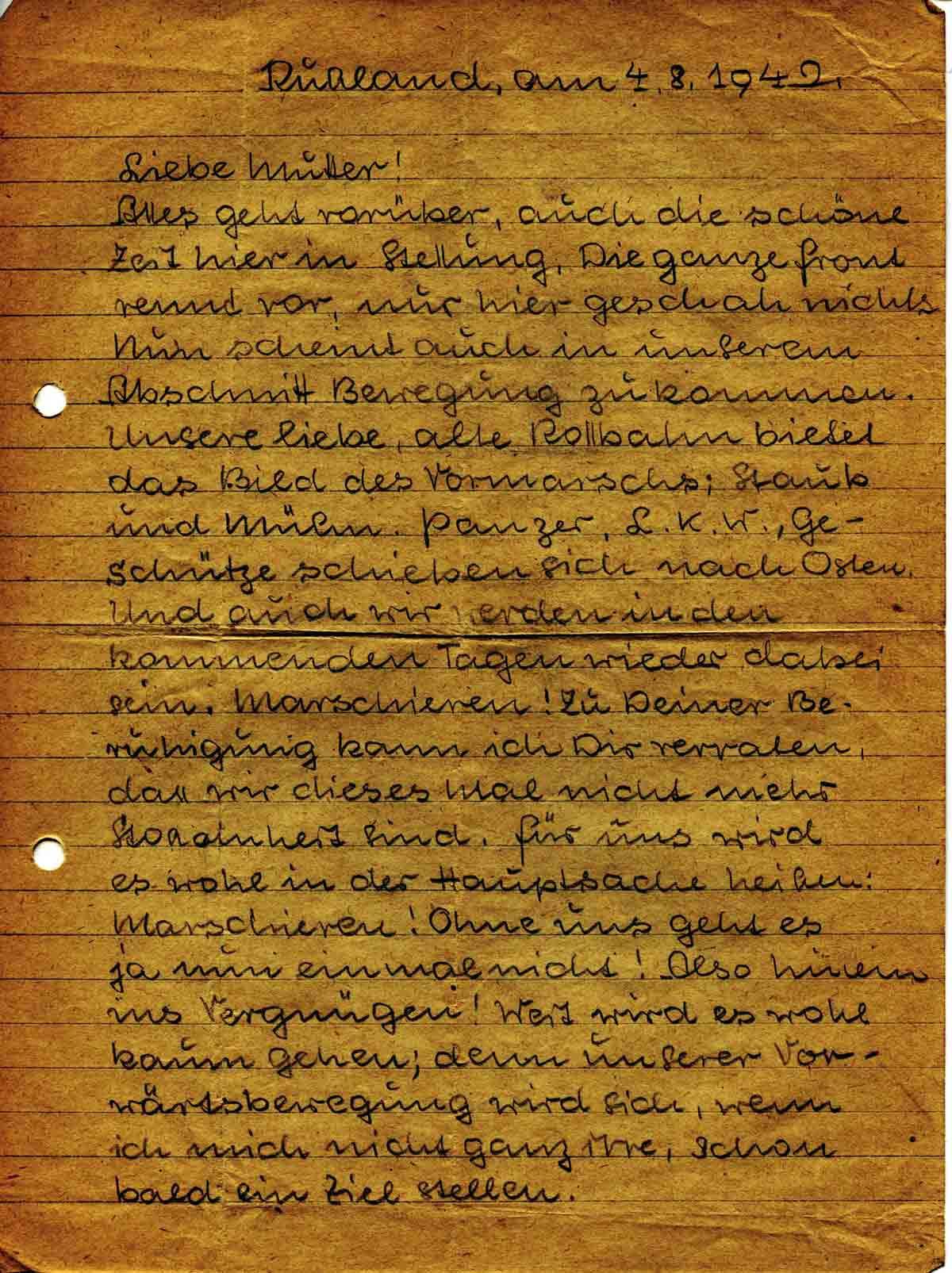 Alles geht vorüber, auch die schöne Zeit hier in Stellung. Die ganze Front rennt vor, nur hier geschah nichts. Nun scheint auch in unserem Abschnitt Bewegung zu kommen. Unsere liebe, alte Rollbahn bietet das Bild des Vormarschs; Staub und Mü[..]. Panzer, L.K.W., Geschütze schieben sich nach Osten. Und auch wir werden in den kommenden Tagen wieder dabei sein. Marschieren! Zu Deiner Beruhigung kann ich Dir verraten, dass wir dieses Mal nicht mehr Stoßeinheit sind. Für uns wird es wohl in der Hauptsache heißen: Marschieren! Ohne uns geht es ja nun einmal nicht! Also hinein ins Vergnügen! Weit wird es wohl kaum gehen; denn unserer Vorwärtsbewegung wird sich, wenn ich mich nicht ganz irre, schon bald ein Ziel stellen.