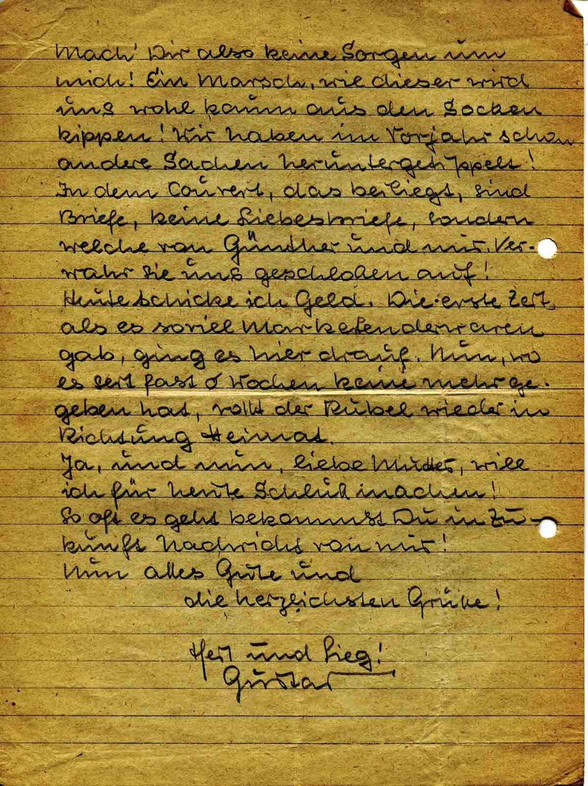 Mach’ Dir also keine Sorgen um mich! Ein Marsch, wie dieser wird uns wohl kaum aus den Socken kippen! Wir haben im Vorjahr schon andere Sachen heruntergetippelt ! In dem Couvert, das beiliegt, sind Briefe, keine Liebesbriefe, sondern welche von Günther und mir. Verwahr sie uns geschlossen auf!