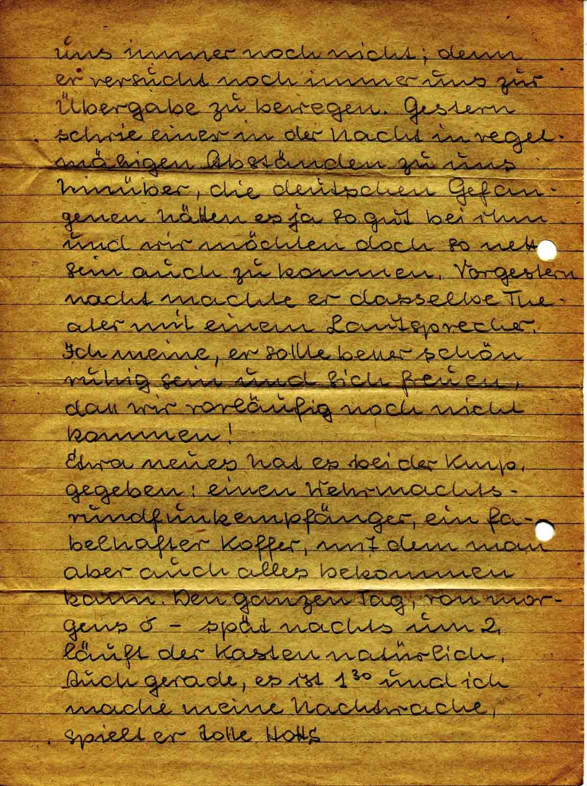 Etwas neues hat es bei der Kmp. gegeben: einen Wehrmachtsrundfunkempfänger, ein fabelhafter Koffer, mit dem man aber auch alles bekommen kann. Den ganzen Tag, von morgens 6 – spät nachts um 2 läuft der Kasten natürlich. Auch gerade, es ist 1.30 und ich mache meine Nachtwache, spielt er tolle Hotts.