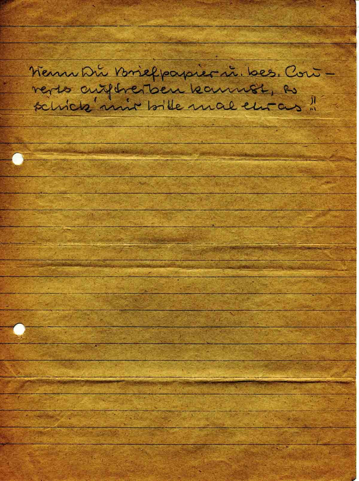 Wie geht es Dir? Was machst Du den Tag über? Hoffentlich nicht „tüten“! Schreib’ mir bitte recht bald und möglichst oft wieder! Für heute will ich nun schließen. In den Brief lege ich wieder 20,-! Weiteres folgt laufend! Luftfeldpostmarken für August haben wir noch nicht bekommen!
