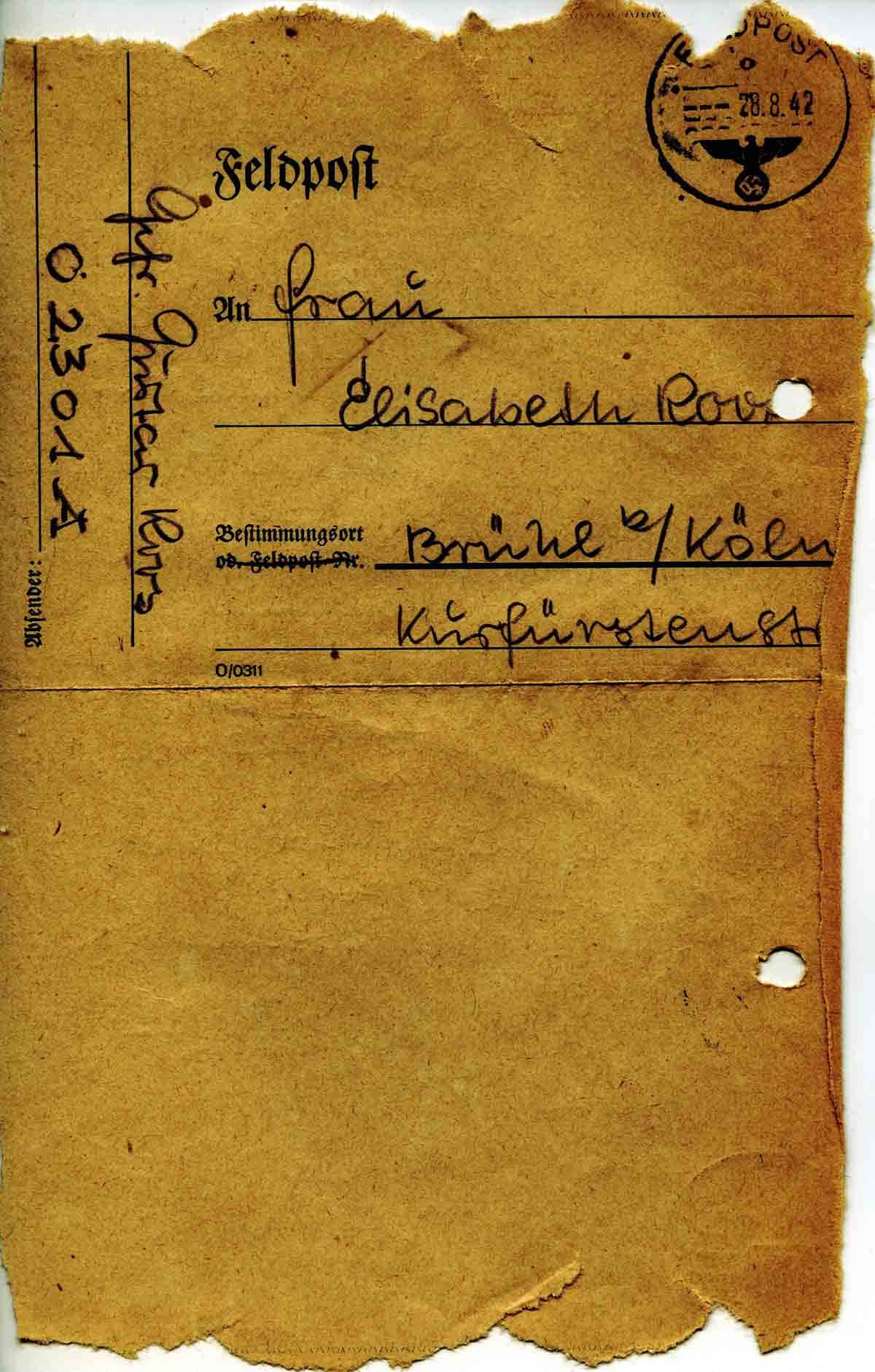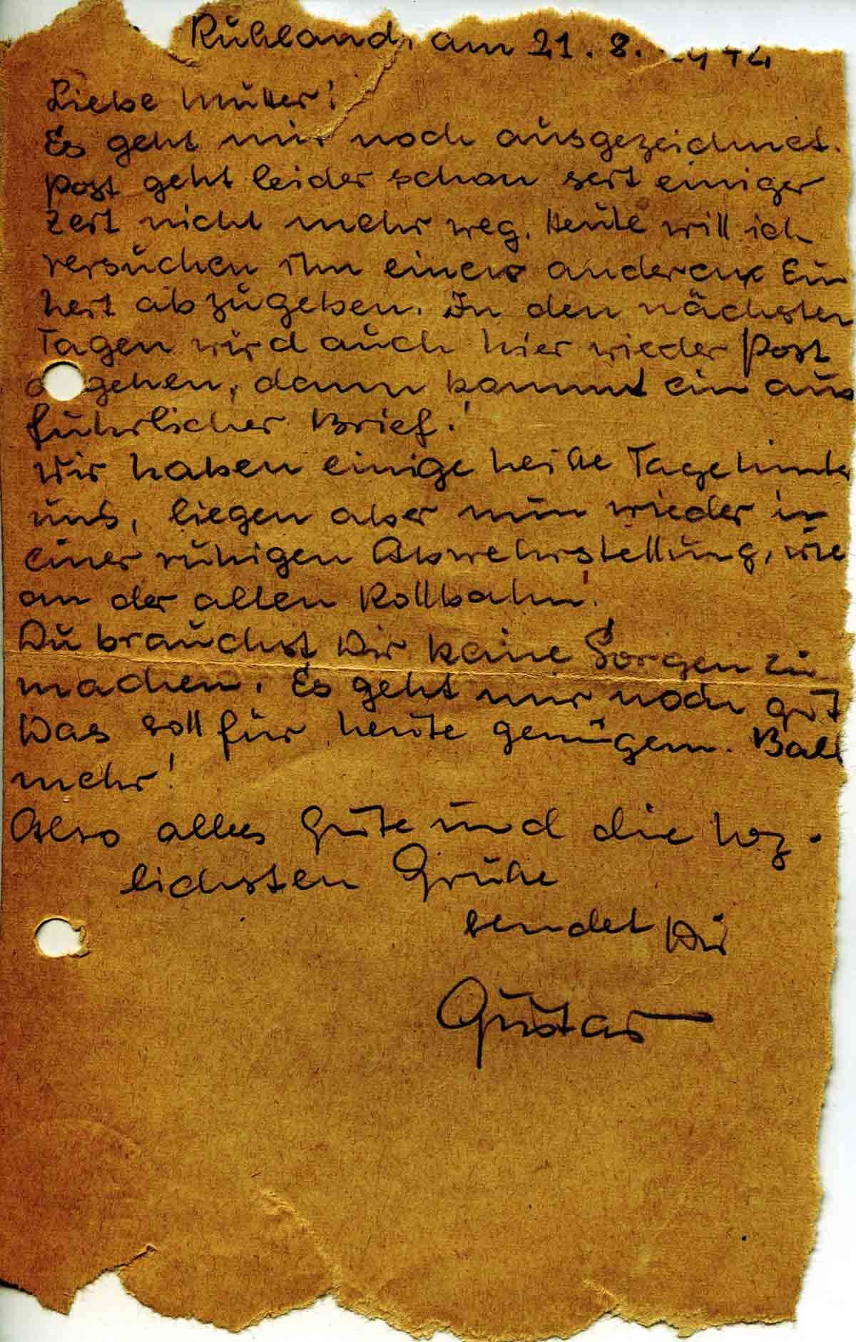 Gustav Roos an Mutter Elisabeth, 21. August 1942