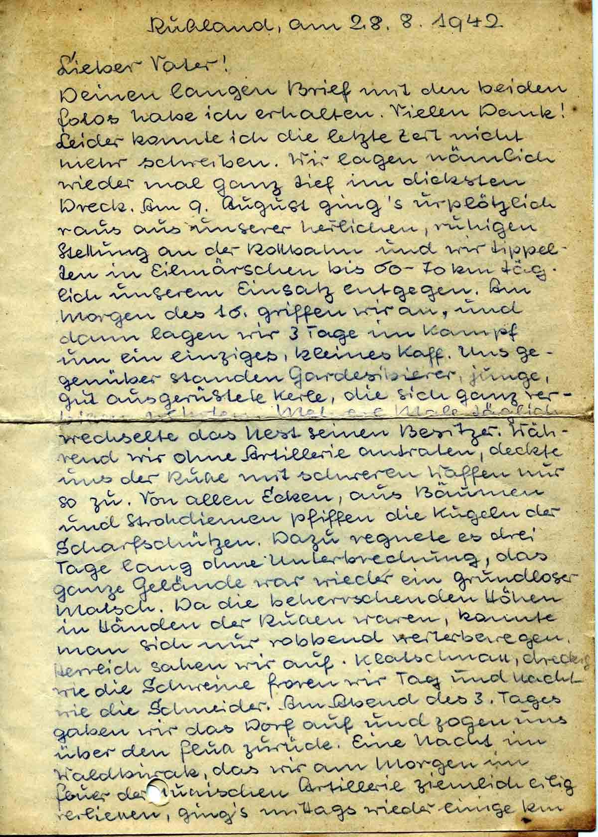 Deinen langen Brief mit den beiden Fotos habe ich erhalten. Vielen Dank! Leider konnte ich die letzte Zeit nicht mehr schreiben. Wir lagen nämlich wieder mal ganz tief im dicksten Dreck. Am 9. August ging’s urplötzlich raus aus unserer herrlichen, ruhigen Stellung an der Rollbahn und wir tippelten in Eilmärschen bis 60-70 km täglich unserem Einsatz entgegen. Am Morgen des 16. griffen wir an, und dann lagen wir 3 Tage im Kampf um ein einziges, kleines Kaff. Uns gegenüber standen Gardesibierer, junge, gut ausgerüstete Kerle, die sich ganz verbissen wehrten. Mehrere Male täglich wechselte das Nest seinen Besitzer. Während wir ohne Artillerie antraten, deckte uns der Russe mit schweren Waffen nur so zu. Von allen Ecken, aus Bäumen und Strohdiemen pfiffen die Kugeln der Scharfschützen. Dazu regnete es drei Tage lang ohne Unterbrechung, das ganze Gelände war wieder ein grundloser Matsch. Da die beherrschenden Höhen in Händen der Russen waren, konnte man sich nur robbend weiterbewegen. Herrlich sahen wir auf. Klatschnass, dreckig wie die Schweine froren wir Tag und Nacht wie die Schneider. Am Abend des 3. Tages gaben wir das Dorf auf und zogen uns über den Fluss zurück. Eine Nacht im Waldbiwak, das wir am Morgen im Feuer der russischen Artillerie ziemlich eilig verliessen, ging’s mittags wieder einige km