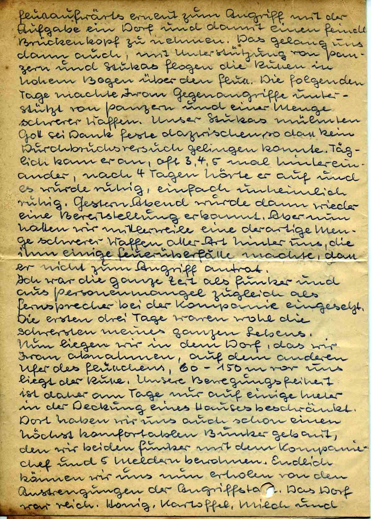 Ich war die ganze Zeit als Funker und aus Personenmangel zugleich als Fernsprecher bei der Kompanie eingesetzt. Die ersten drei Tage waren wohl die schwersten meines ganzen Lebens. Nun liegen wir in dem Dorf, das wir Iwan abnahmen, auf dem anderen Ufer des Flüsschens, 60-150 m vor uns liegt der Russe. Unsere Bewegungsfreiheit ist daher am Tage nur auf einige Meter in der Deckung eines Hauses beschränkt. Dort haben wir uns auch schon einen höchst komfortablen Bunker gebaut, den wir beiden Funker mit dem Kompaniechef und 5 Meldern bewohnen. Endlich können wir uns nun erholen von den Anstrengungen der Angriffstage. Das Dorf war reich. Honig, Kartoffel, Milch und