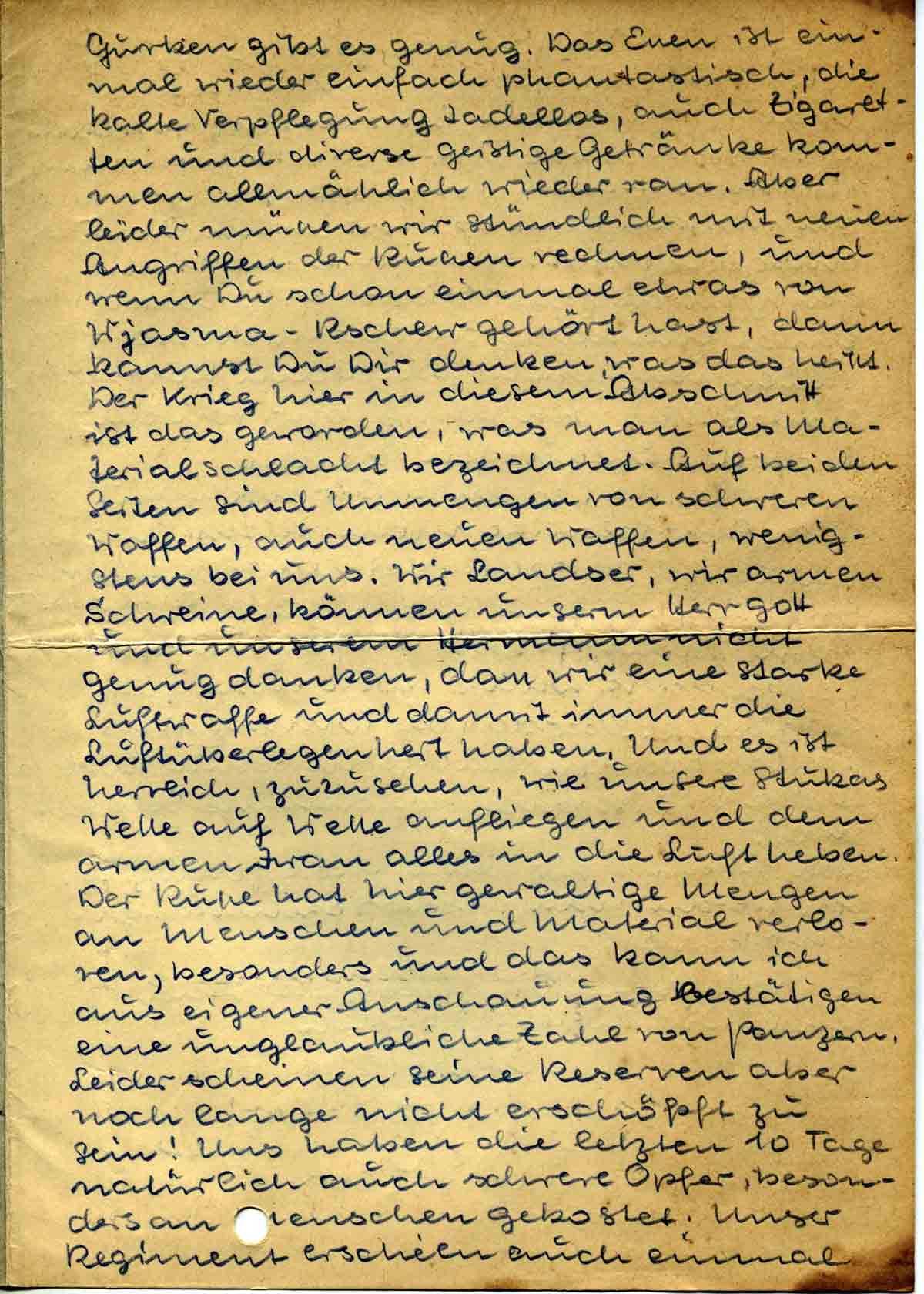 Gurken gibt es genug. Das Essen ist einmal wieder einfach phantastisch, die kalte Verpflegung tadellos, auch Zigaretten und diverse geistige Getränke kommen allmählich wieder ran. Aber leider müssen wir stündlich mit neuen Angriffen der Russen rechnen, und wenn Du schon einmal etwas von Wjasma-Rschew gehört hast, dann kannst Du Dir denken, was das heisst. Der Krieg hier in diesem Abschnitt ist das geworden, was man als Materialschlacht bezeichnet. Auf beiden Seiten sind Unmengen von schweren Waffen, auch neuen Waffen, wenigstens bei uns. Wir Landser, wir armen Schweine, können unserm Herrgott und unserem Hermann nicht genug danken, dass wir eine starke Luftwaffe und damit immer die Luftüberlegenheit haben. Und es ist herrlich, zuzusehen, wie unsere Stukas Welle auf Welle anfliegen und dem armen Iwan alles in die Luft heben. Der Russe hat hier gewaltige Mengen an Menschen und Material verloren, besonders und das kann ich aus eigener Anschauung bestätigen eine unglaubliche Zahl von Panzern. Leider scheinen seine Reserven aber noch lange nicht erschöpft zu sein! Uns haben die letzten 10 Tage natürlich auch schwere Opfer, besonders an Menschen gekostet. Unser Regiment erschien auch einmal
