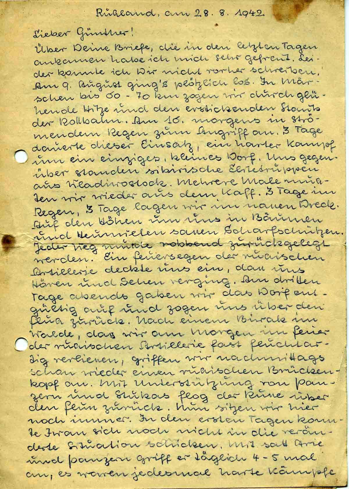 Über Deine Briefe, die in den letzten Tagen ankamen habe ich mich sehr gefreut. Leider konnte ich Dir nicht vorher schreiben. Am 9. August ging’s plötzlich los. In Märschen bis 60-70 km zogen wir durch glühende Hitze und den erstickenden Staub der Rollbahn. Am 16. morgens in strömendem Regen zum Angriff an. 3 Tage dauerte dieser Einsatz, ein harter Kampf um ein einziges, kleines Dorf. Uns gegenüber standen sibirische Elitetruppen aus Wladiwostock. Mehrere Male mussten wir wieder aus dem Kaff. 3 Tage im Regen, 3 Tage lagen wir im nassen Dreck. Auf den Höhen um uns in Bäumen und Heumieten sassen Scharfschützen. Jeder Weg musste robbend zurückgelegt werden. Ein Feuersegen der russischen Artillerie deckte uns ein, dass uns Hören und Sehen verging. Am dritten Tage abends gaben wir das Dorf entgültig auf und zogen uns über den Fluss zurück. Nach einem Biwak im Walde, dass wir am Morgen im Feuer der russischen Artillerie fast fluchtartig verliessen, griffen wir nachmittags schon wieder einen russischen Brückenkopf an. Mit Unterstützung von Panzern und Stukas flog der Russe über den Fluss zurück. Nun sitzen wir hier noch immer. In den ersten Tagen konnte Iwan sich noch nicht in die veränderte Situation schicken. Mit satt Arie und Panzern griff er täglich 4-5 mal an, es waren jedesmal harte Kämpfe.