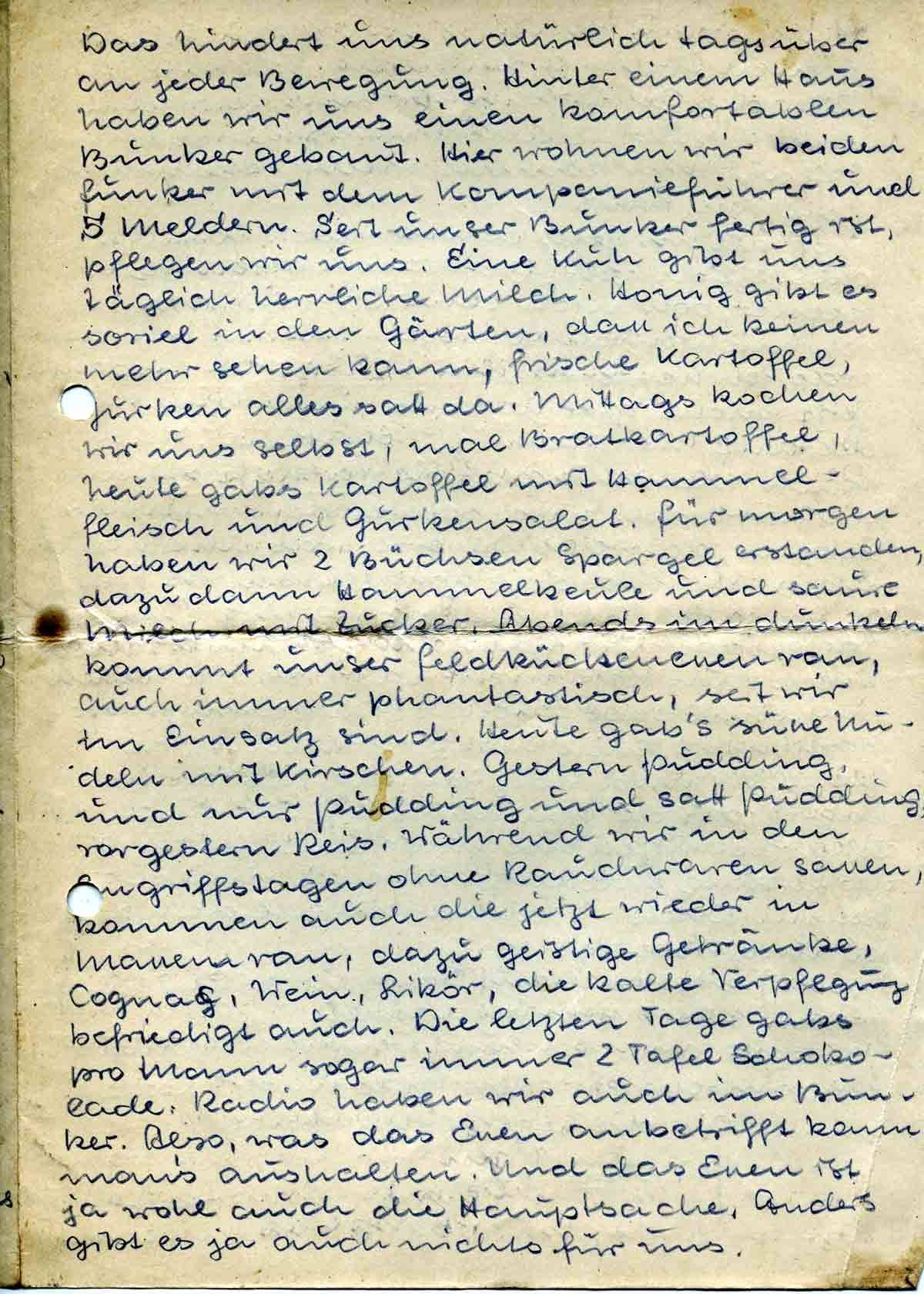 Das hindert uns natürlich tagsüber an jeder Bewegung. Hinter einem Haus haben wir uns einen komfortablen Bunker gebaut. Hier wohnen wir beiden Funker mit dem Kompanieführer und 5 Meldern. Seit unser Bunker fertig ist, pflegen wir uns. Eine Kuh gibt uns täglich herrliche Milch. Honig gibt es soviel in den Gärten, dass ich keinen mehr sehen kann, frische Kartoffel, Gurken alles satt da. Mittags kochen wir uns selbst, mal Bratkartoffel, heute gabs Kartoffel mit Hammelfleisch und Gurkensalat. Für morgen haben wir 2 Büchsen Spargel erstanden, dazu dann Hammelkeule und saure Milch mit Zucker. Abends im dunkeln kommt unser Feldküchenessen ran, auch immer phantastisch, seit wir im Einsatz sind. Heute gab’s süße Nudeln mit Kirschen. Gestern Pudding, und nur Pudding und satt Pudding, vorgestern Reis. Während wir in den Angriffstagen ohne Rauchwaren sassen, kommen auch die jetzt wieder in Massen ran, dazu geistige Getränke, Cognac, Wein, Likör, die kalte Verpflegung befriedigt auch. Die letzten Tage gabs pro Mann sogar immer 2 Tafel Schokolade. Radio haben wir auch im Bunker. Also, was das Essen anbetrifft kann man’s aushalten. Und das Essen ist ja wohl auch die Hauptsache. Anders gibt es ja auch nichts für uns.