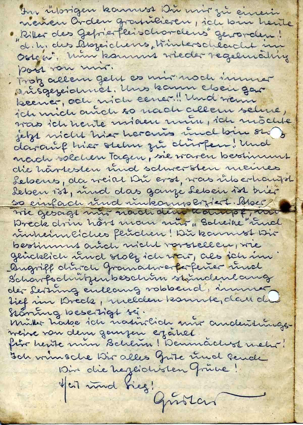Im übrigen kannst Du mir zu einem neuen Orden gratulieren, ich bin heute „Ritter des Gefrierfleischordens“ geworden! d. h. des Abzeichens „Winterschlacht im Osten“. Nun kommt wieder regelmäßig Post von mir.
