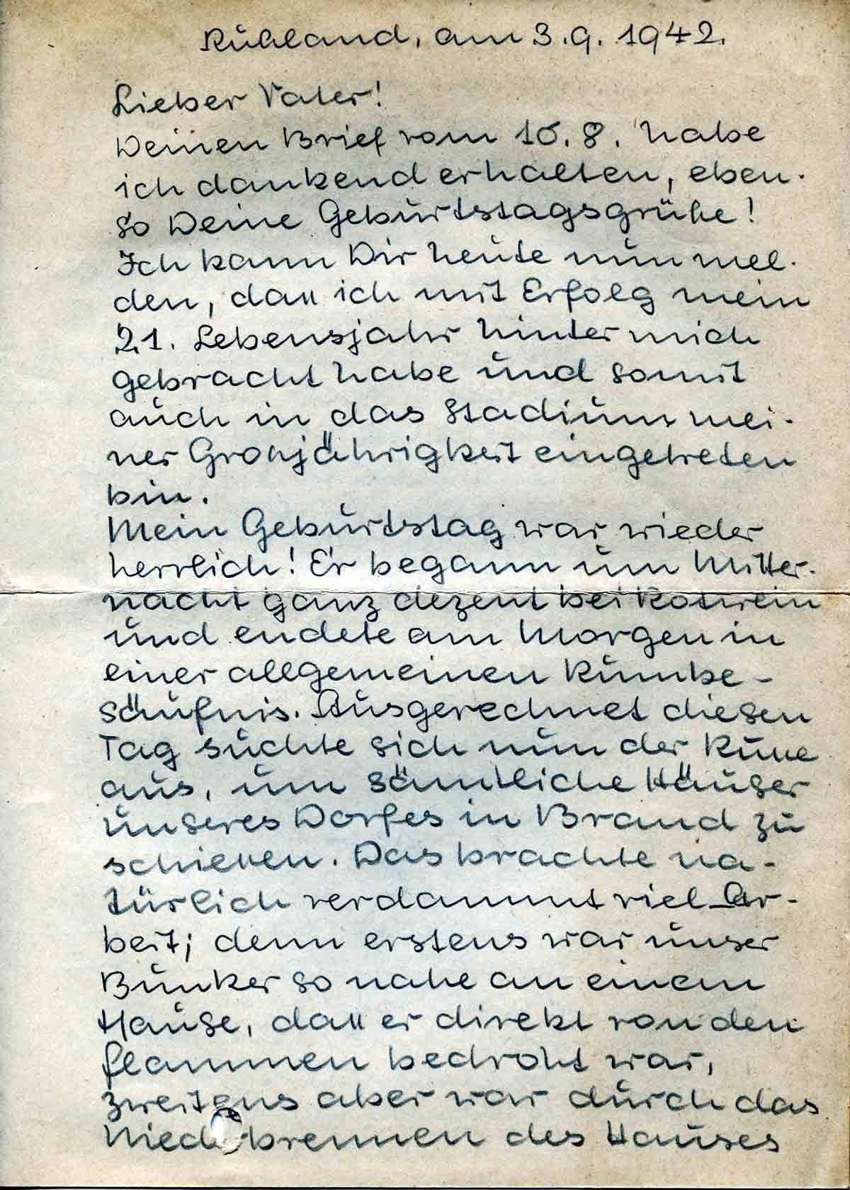Deinen Brief vom 16.8. habe ich dankend erhalten, ebenso Deine Geburtstagsgrüße! Ich kann Dir heute nun melden, dass ich mit Erfolg mein 21. Lebensjahr hinter mich gebracht habe und somit auch in das Stadium meiner Großjährigkeit eingetreten bin.