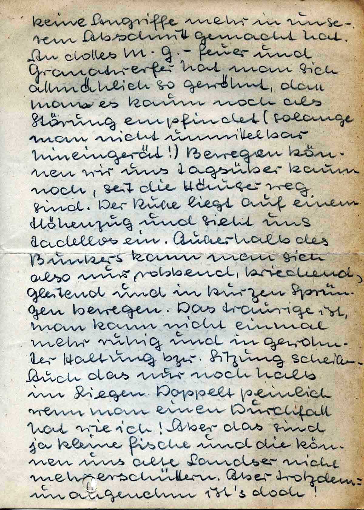 keine Angriffe mehr in unserem Abschnitt gemacht hat. An dolles M-G.-Feuer und Granatwerfer hat man sich allmählich so gewöhnt, dass man es kaum noch als Störung empfindet (solange man nicht unmittelbar hineingerät!) Bewegen können wir uns tagsüber kaum noch, seit die Häuser weg sind. Der Russe liegt auf einem Höhenzug und sieht uns tadellos ein. Außerhalb des Bunkers kann man sich also nur robbend, kriechend, gleitend und in kurzen Sprüngen bewegen. Das traurige ist, man kann nicht einmal mehr ruhig und in gewohnter Haltung bzw. Sitzung scheißen. Auch das nur noch halb im Liegen. Doppelt peinlich wenn man einen Durchfall hat wir ich! Aber das sind ja kleine Fische und die können uns alte Landser nicht mehr erschüttern. Aber trotzdem: unangenehm ist’s doch!