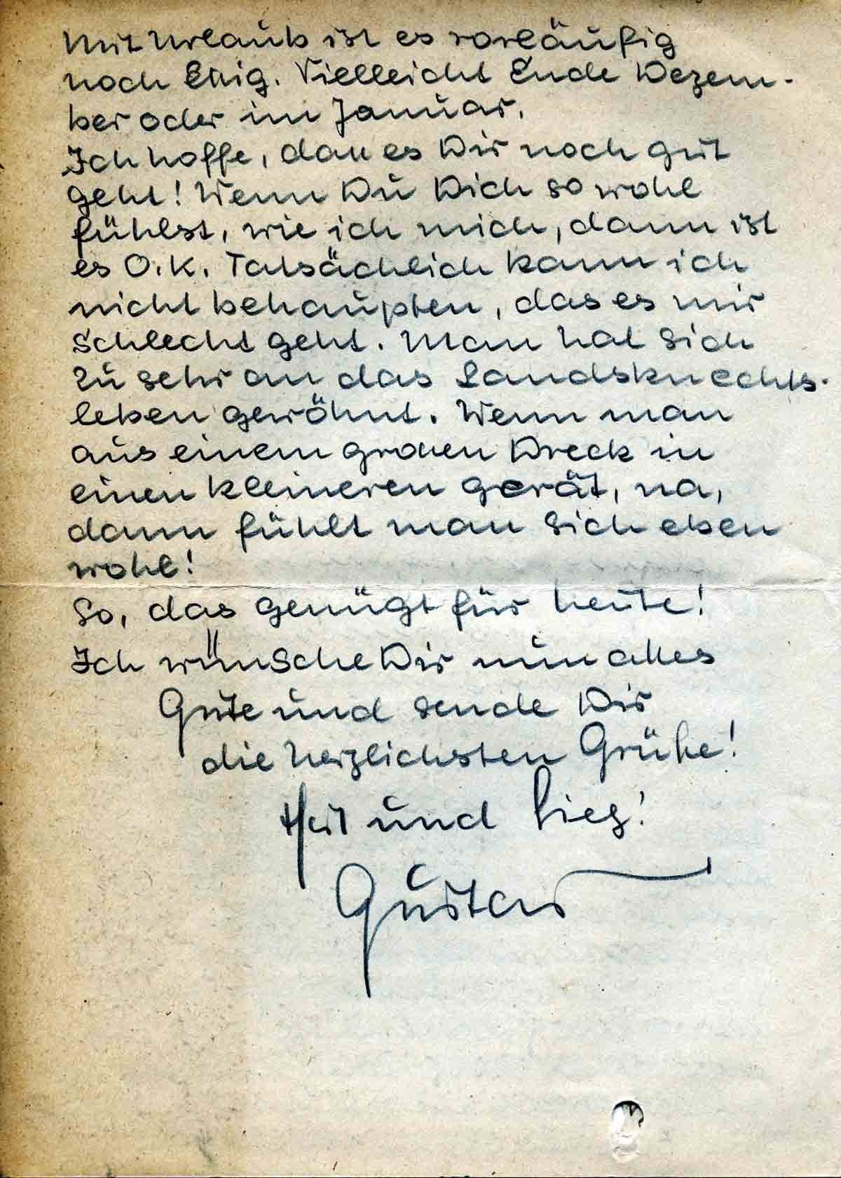 Im übrigen geht es mir ausgezeichnet (Das macht das gute Essen!) Marketendereiwaren haben wir satt da. Du wirst Dich hinsetzen, wenn Du hörst, dass ich allein für über 40,- Zigaretten und Tabak gekauft habe. Natürlich bekommt Günther davon ab. Geld habe ich ihm schon geschickt. Du siehst, ich habe eine ganz großzüge Hilfsaktion für den armen Arbeitsmann in die Wege geleitet!