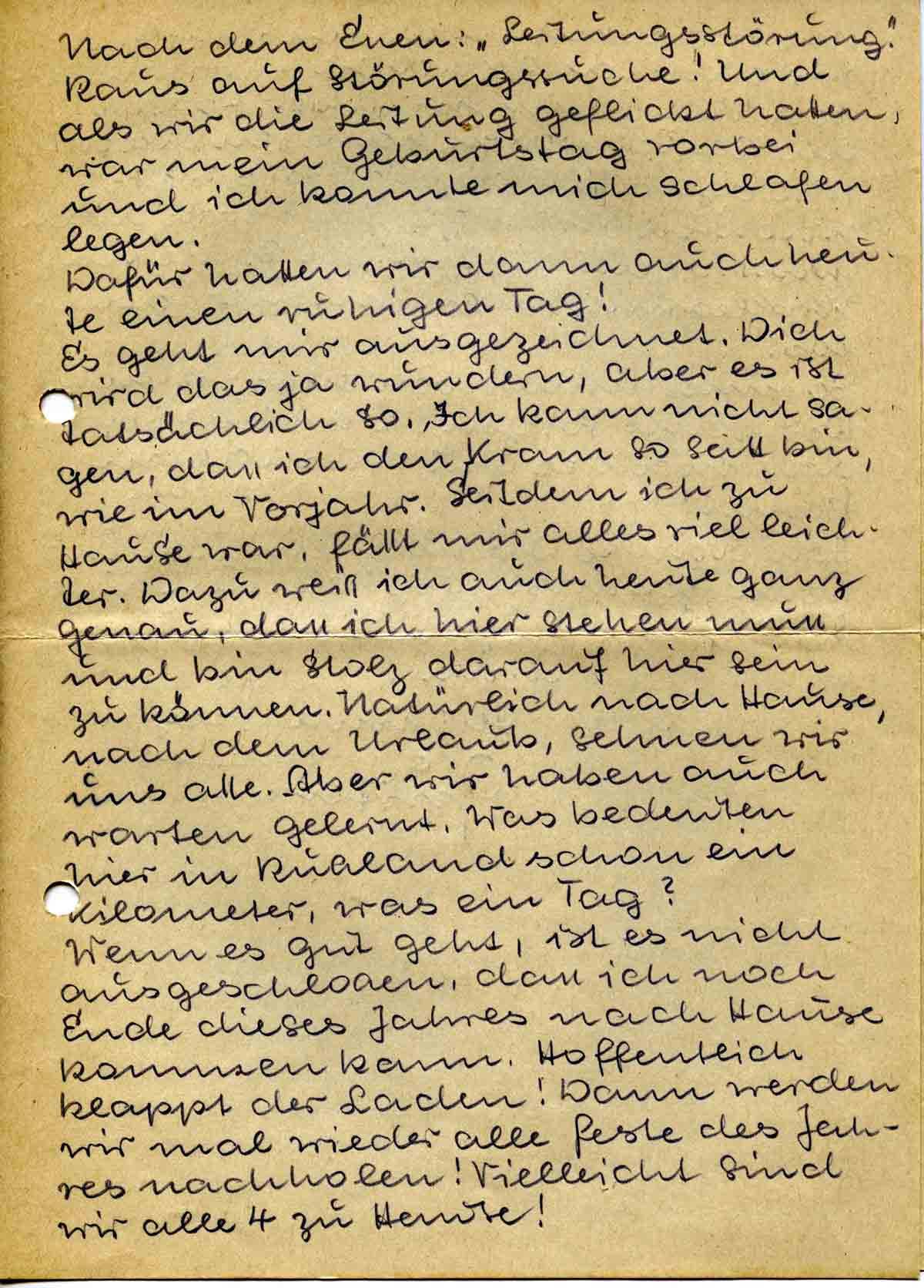Und nun zum Geburtstag! Es ist klar, wenn ich Geburtstag habe, ist was los. Voriges Jahr mußte ich an dem Tag 5, 6 mal umziehen, dieses Jahr kam es noch schöner. Der Tag fing wunderbar an. Um Mitternacht sassen wir 3 Fernsprecher zusammen bei Rotwein, guten Zigaretten, Keks und Schokolade. Dann kamen der Kmp-Chef und die Melder dazu und nun wurde Rum gesoffen, ich sage „gesoffen“, denn solche Mengen Rum habe ich noch nie auf einmal zu mir genommen. Bis gegen 5.00 dauerte die Tour, dann melkten wir noch