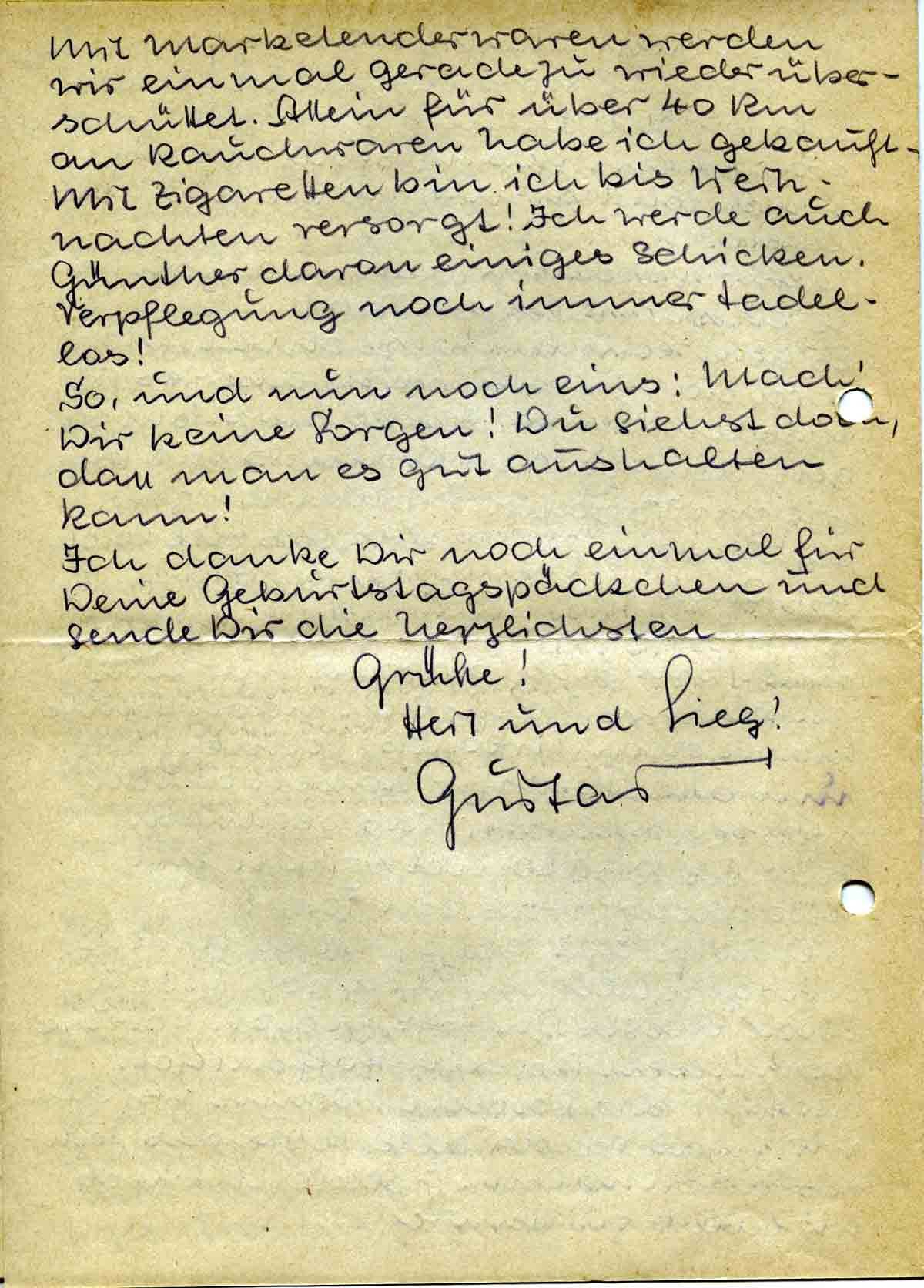 Mit Marketenderwaren werden wir einmal geradezu wieder überschüttet. Allein für über 40 Rm an Rauchwaren habe ich gekauft. Mit Zigaretten bin ich bis Weihnachten versorgt! Ich werde auch Günther davon einiges schicken. Verpflegung noch immer tadellos!