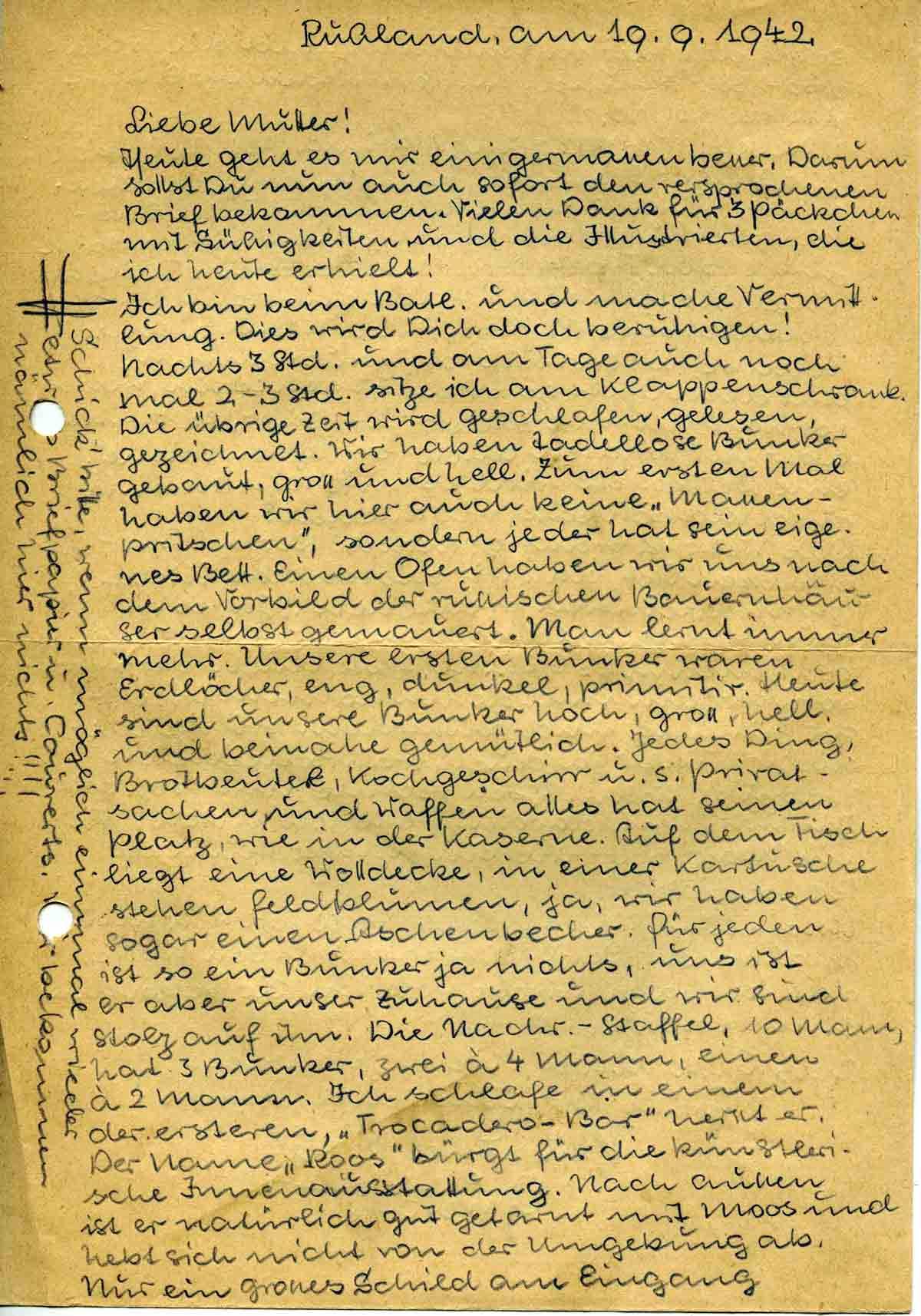 Gustav Roos an Mutter Elisabeth, 19. September 1942