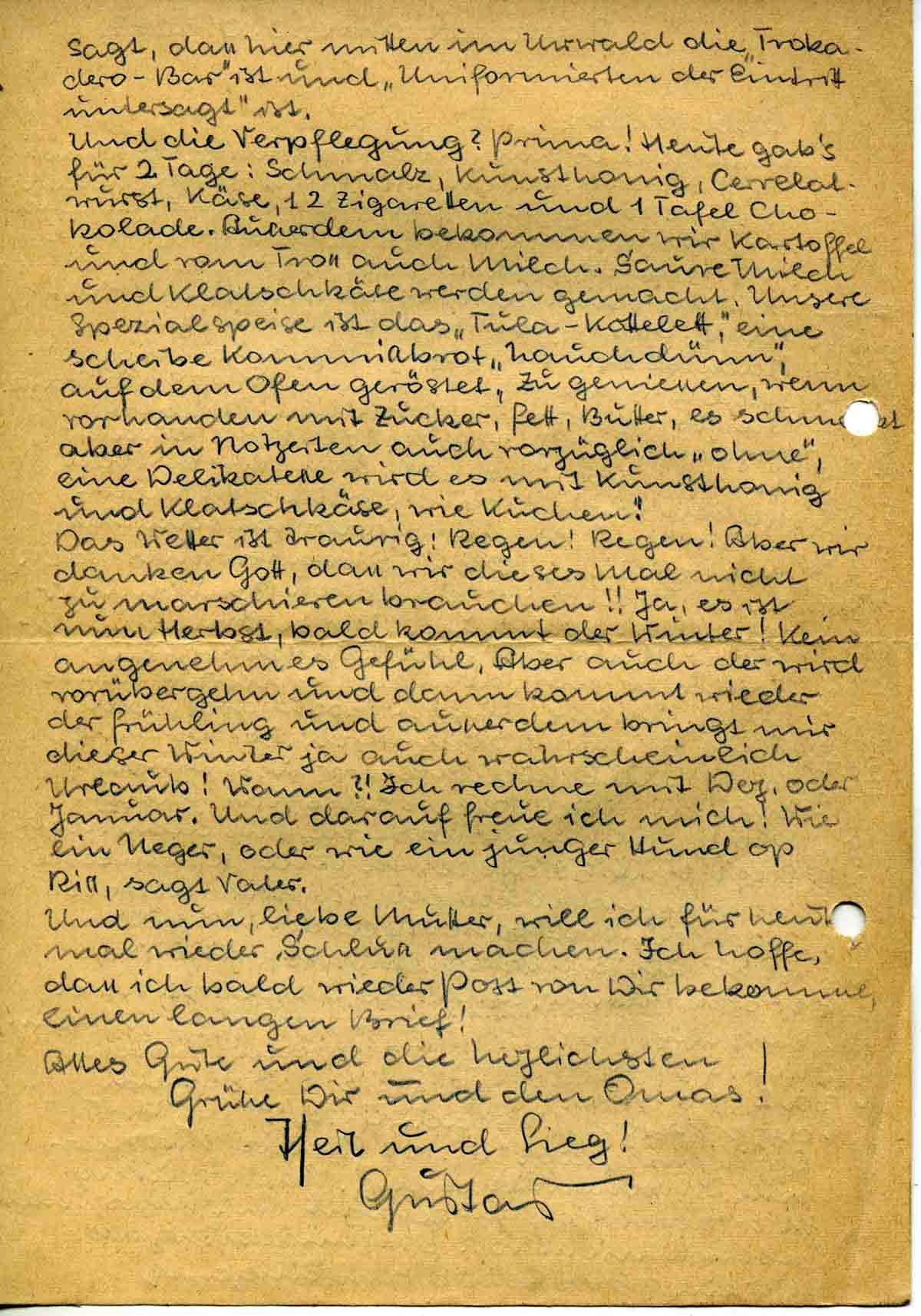 Und nun, liebe Mutter, will ich für heute mal wieder Schluss machen. Ich hoffe, dass ich bald wieder Post von Dir bekomme, einen langen Brief!