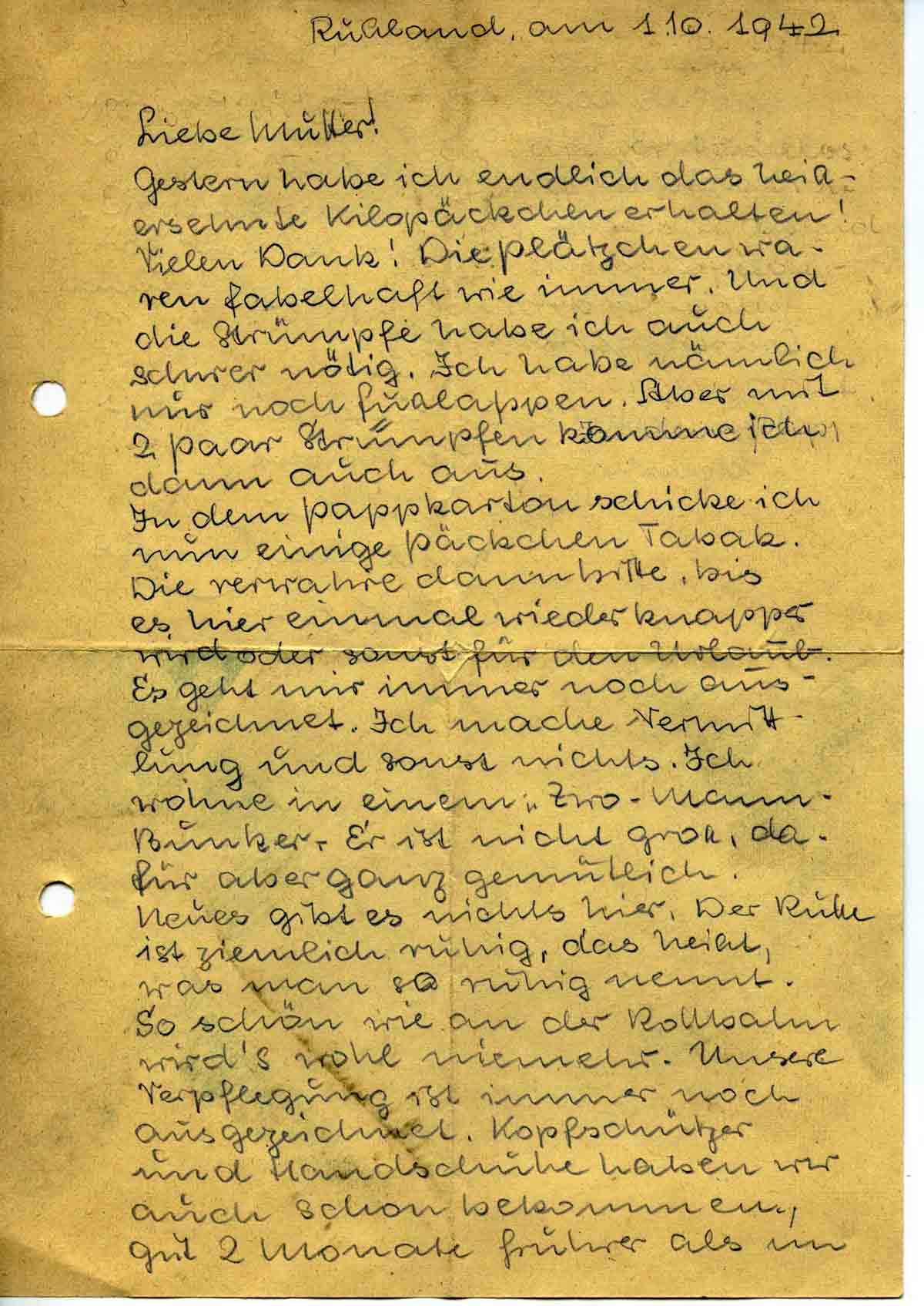 Gustav Roos an Mutter Elisabeth, 1. Oktober 1942