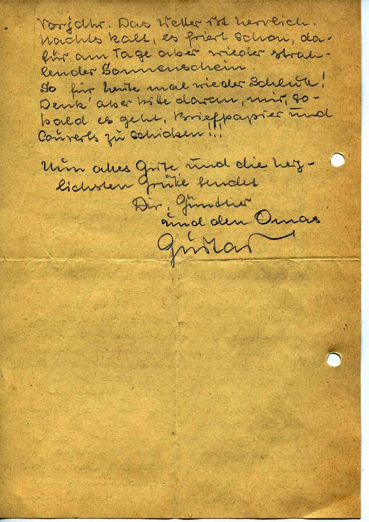 So für heute mal wieder Schluss! Denk’ aber bitte daran, mir, sobald es geht, Briefpapier und Couverts zu schicken!!!