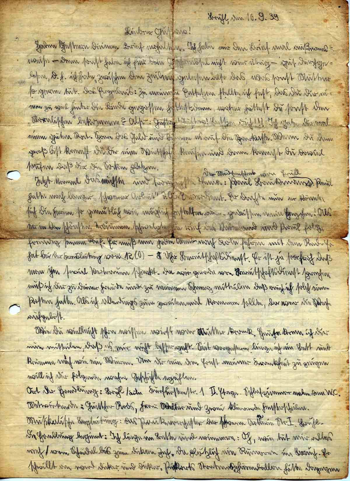 Jetzt kommt das nächste und traurigste Thema: Der Mädchenschreck von Brühl, Paul Braukmann, hatte nach langer, schwerer Arbeit 20 RM verdient. Er dachte nun könnte er die Ferien so gemütlich wie möglich gestalten, aber, gedrissen, mein Herzchen! Als er in den schönsten Träumen schwelgte, da rief das Vaterland, und Paul folgte freudig seinem Ruf. Er muß nun jeden Abend nach Köln fahren mit dem Rad. Er hat bei der Kreisleitung von 0 bis 8 Uhr Bereitschaftsdienst. Er ist ja sooo froh, daß man ihm soviel Vertrauen schenkt. Da wir gerade von Bereitschaftsdienst sprechen, muß ich Dir zu deiner Freude und meinem Schmerz mit-teilen, daß auch ich solch einen Posten hatte. Als ich allerdings zum zweitenmal kommen sollte, da war die Wache aufgelöst.