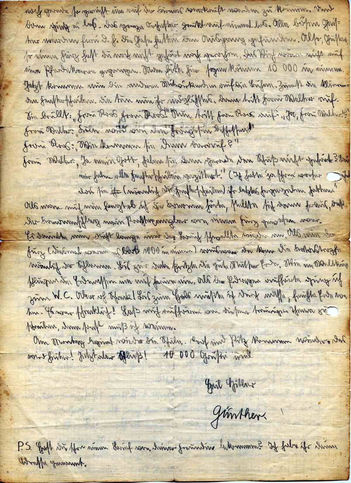 Haben gestern Deinen Brief erhalten. Ich habe mir den Brief mal ausnahmsweise,-denn sonst habe ich für Dein Geschreibsel nicht viel übrig,- gut durchgelesen, d.h. ich habe zwischen den Zeilen gelesen, also das, was sonst Mutter so gerne tut. Das Ergebnis: Zu meinem Entsetzen stellte ich fest, daß Du dir einen zuviel hinter die Binde gegossen hattest. Denn woher hättest Du sonst den „Moralischen“ bekommen? Also: Gustav, Gustav! Bessre Dich! Ich gebe Dir mal einen guten Rat: Spare das Geld und bringe es auf die Sparkasse. Wenn Du dann groß bist, kannst Du dir eine Wirtschaft kaufen und dann kannst Du soviel saufen, daß Dir die Socken platzen.