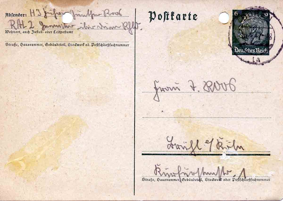Habe heute Deinen Brief vom 13.d.M. erhalten und mich sehr gefreut. Allerdings war ich leicht geknickt, als ich hörte, daß Gustav wieder ab nach Rußland ist. Mache Dir aber nur keine Sorgen, denn er kommt zurück. Auch ich werde in den nächsten Tagen eintrudeln, d.h. im Lauft des Sonntags. Genaues weiß ich auch noch nicht. Das wären also nur noch vier Tage, bis ich wieder bei Dir bin. Ich muß Dir schon das Geständnis machen, so schwer es mir auch fällt, daß ich froh bin, wenn ich wieder zu Hause bin. Hier das Leben fällt einem nämlich langsam aber sicher auf die Nerven. Es geht doch nichts für Zivilleben. Mein einziger Trost ist mein Geschwür an der Ferse. Gestern habe ich den ganzen Nachmittag in der Sonne gelegen, und ich bilde mir ein, ich wäre etwas rot geworden. Na, so könnte man es aushalten. So habe ich aber bis zu einem gewissen Grade die Nase voll. Du wirst ja triumphieren, wenn Du diesen Brief liest. Ich werde das wohl täglich unter die Nase gerieben bekommen. Das wird mir aber nichts mehr ausmachen, denn ich bin schon richtig stur geworden. Na, jetzt aber Schluß. Ich bin nämlich müde, und gehe jetzt ins Bett, denn bald ist Zapfenstreich. Also nochmals alles Gute und die besten Grüße und Küsse bis in 4 Tagen.