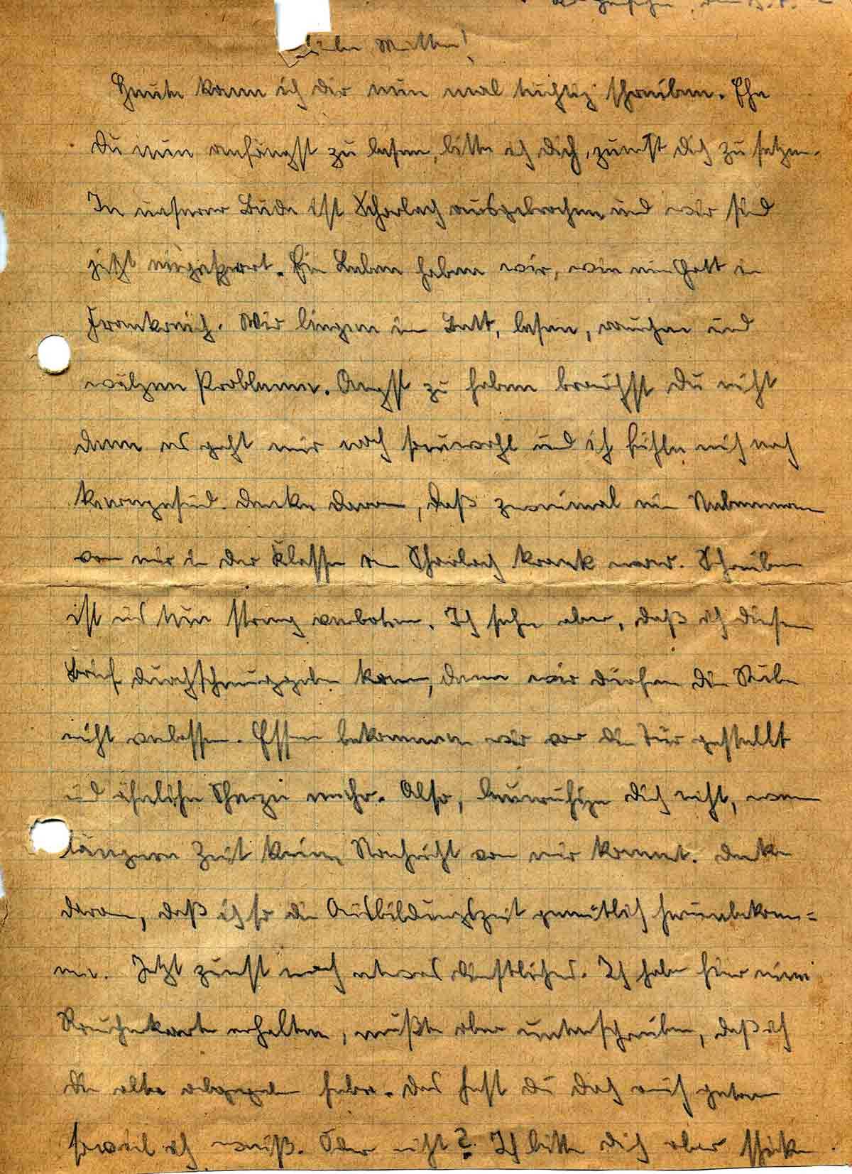 Heute kann ich Dir nun mal tüchtig schreiben. Ehe Du nun anfängst zu lesen, bitte ich Dich, Zuerst Dich zu setzen. In unserer Bude ist Scharlach ausgebrochen und wir sind eingesperrt. Ein Leben haben wir, wie ein Gott in Frankreich. Wir liegen im Bett, lesen, rauchen und wälzen Probleme. Angst zu haben brauchst Du nicht, denn es geht mir noch sauwohl, und ich fühle mich noch kerngesund. Denke daran, daß zweimal ein Nebenmann von mir in der Klasse an Scharlach krank war. Schreiben ist uns nun streng verboten. Ich sehe aber, daß ich diesen Brief durchschmuggeln kann, denn wir dürfen die Stube nicht verlassen. Essen bekommen wir vor die Tür gestellt, und ähnliche Scherze mehr. Also, beunruhige Dich nicht, wenn längere Zeit keine Nachricht von mir kommt. Denke daran, daß ich so die Ausbildungszeit gemütlich herum bekomme. Jetzt zuerst noch etwas Dienstliches. Ich habe hier eine Raucherkarte erhalten, musste aber unterschreiben, daß ich die alte abgegeben habe. Das hast Du doch auch getan, soviel ich weiß. Oder nicht? Ich bitte dich aber, schicke