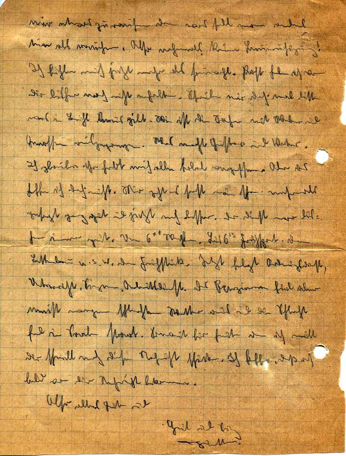 mir etwas zu rauchen, denn was soll man anders tun als rauchen. Also nochmals, keine Beunruhigung! Ich fühle mich jetzt mehr als sauwohl. Post habe ich bisher von Dir noch nicht erhalten. Schreibe mir doch mal bitte, was es in Brühl Neues gibt. Wie ist die Sache mit Weber und Genossen ausgegangen? Was macht Gustav und Vater? Ich glaube, ihr habt mich alle total vergessen. Aber das hoffe ich doch nicht. Mir geht es sonst, wie schon mehrmals gesagt, ganz gut, und jetzt noch besser. Der Dienst war bisher immer gut. Um 6 Uhr Wecken, bis 6.15 Frühsport, dann Bettenbau u.s.w., dann Frühstück. Jetzt folgt Ordnungsdienst, Unterricht, Singen, Arbeitsdienst. Das Exerzieren fiel aber meist wegen schlechtem Wetter aus, und die Schlacht fand im Saale statt. Soweit für heute, denn ich will Dir schnell noch diese Nachricht schicken. Ich hoffe, daß ich bald von Dir Nachricht bekomme.