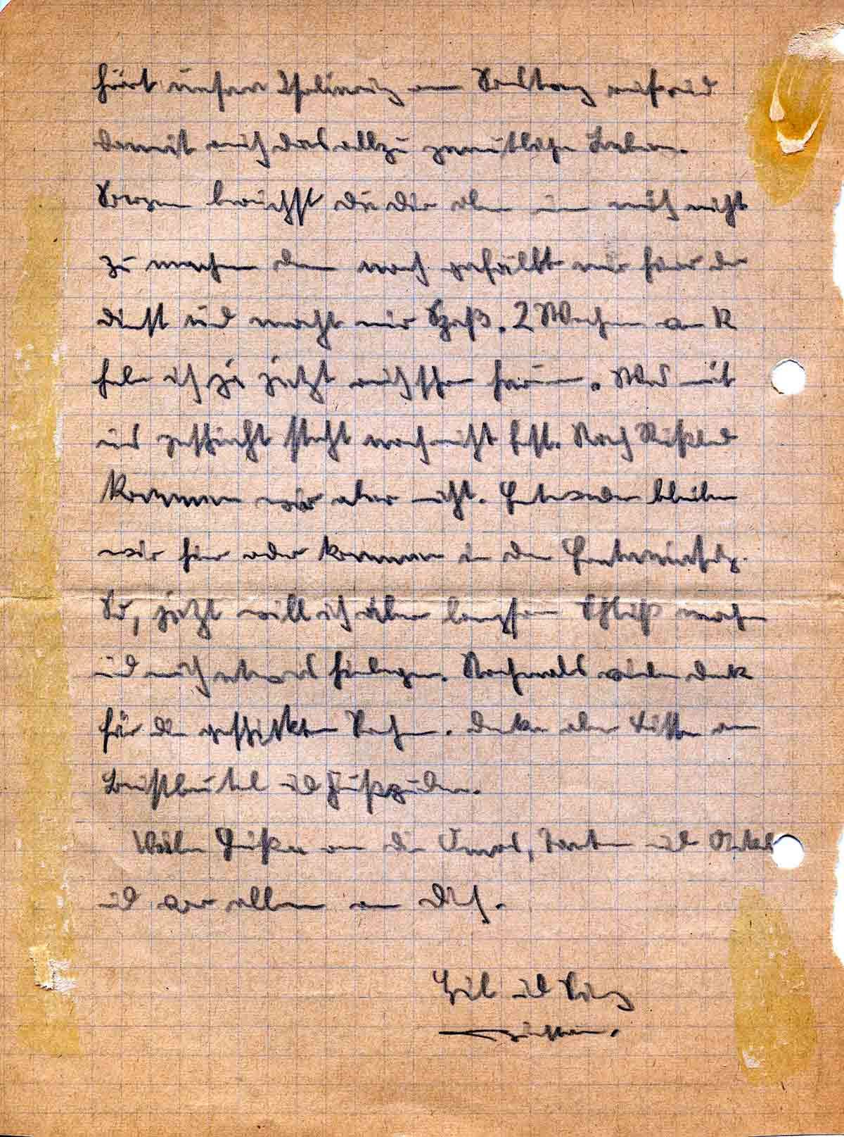 hört unsere Isolierung am Samstag auf und damit auch das allzu gemütliche Leben. Sorgen brauchst Du Dir aber um mich nicht zu machen, denn noch gefällt mir hier der Dienst und macht mir Spaß. 2 Wochen von 12 habe ich ja jetzt auch schon herum. Was mit uns geschieht, steht noch nicht fest. Nach Rußland kommen wir aber nicht. Entweder bleiben wir hier, oder kommen in den Ernteeinsatz. So, jetzt will ich aber langsam Schluß machen und mich etwas hinlegen. Nochmals vielen Dank für die geschickten Sachen. Denke aber bitte an Brustbeutel und Fußpuder.