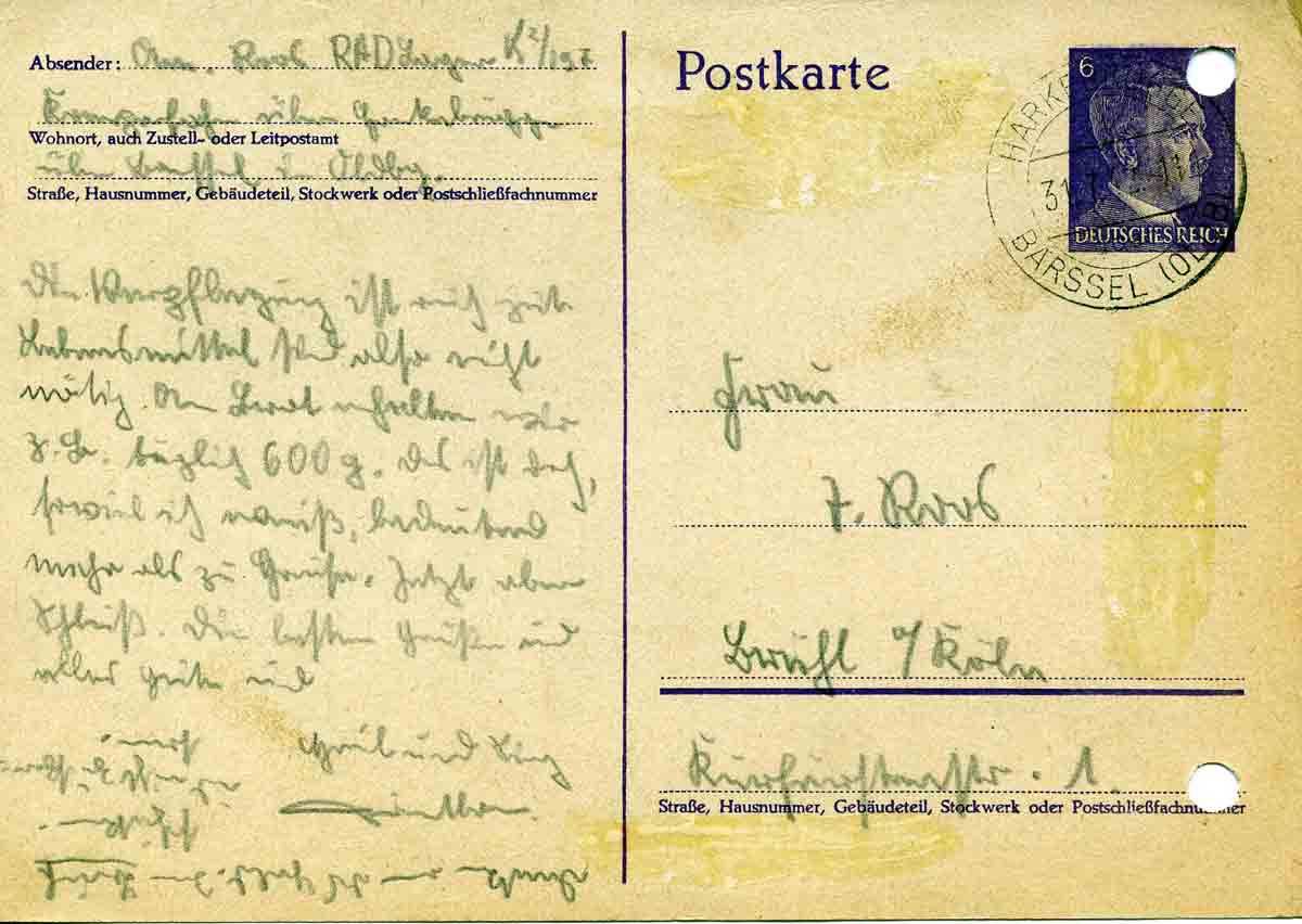 Die Verpflegung ist auch gut. Lebensmittel sind also nicht nötig. An Brot erhalten wir z.B. täglich 600 g. Das ist doch, soviel ich weiß, bedeutend mehr als zu Hause. Jetzt aber Schluß. Die besten Grüße und alles Gute und