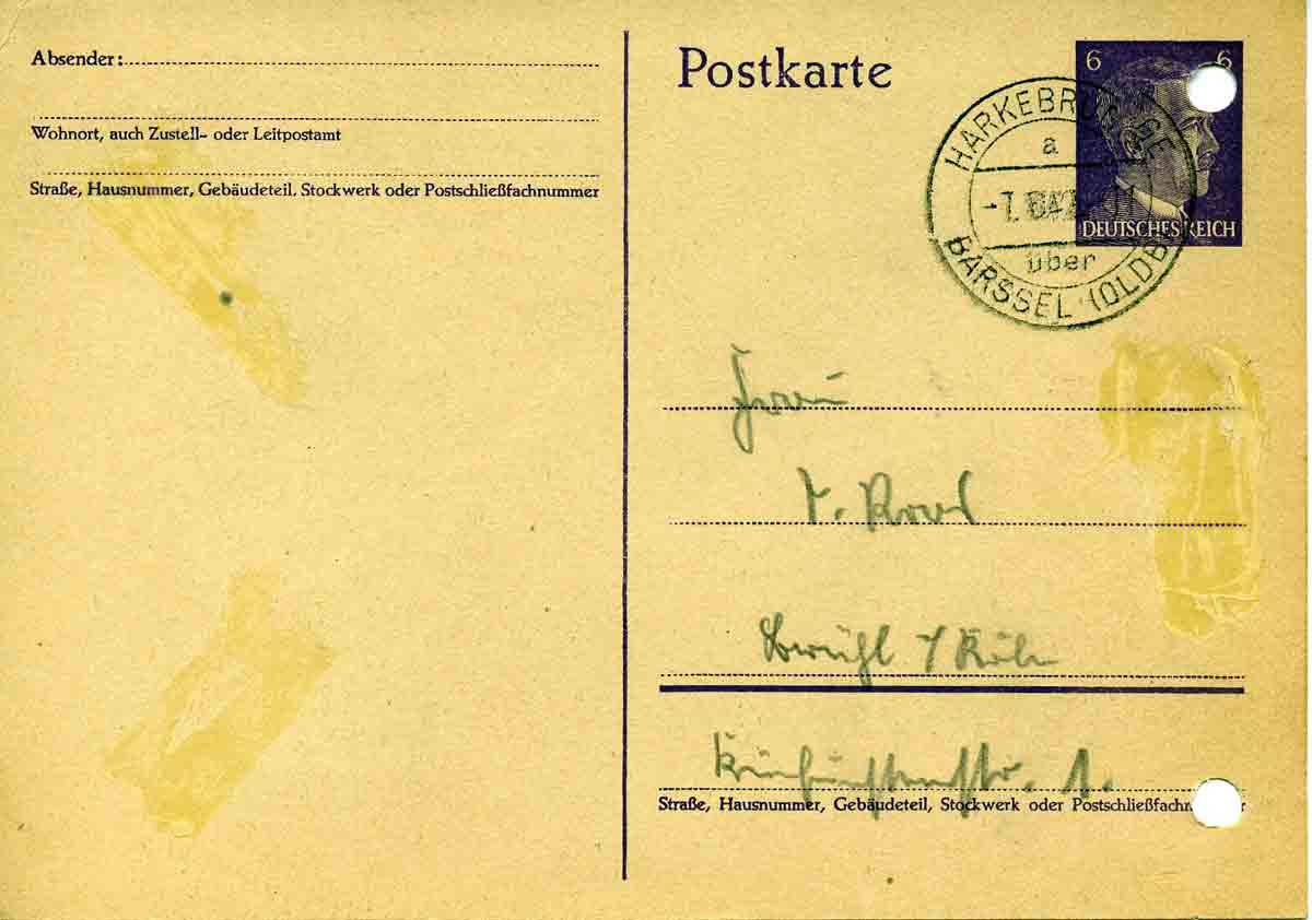 Deinen Brief vom 2.8. und die Illustrierten habe ich erhalten. Von Vater und Gustav habe ich auch Post erhalten. Sie schrieben mir von dem Kampf bzw. schimpften auf St. Malo. Du musst schon entschuldigen daß ich Dir nur eine Karte schreibe, aber ich habe weder Briefpapier noch Zeit. Heute war Vorbesichtigung und in den nächsten Tagen ist die Besichtigung durch den Arbeitsführer. Daher ist hier Hochbetrieb Neues gibt es hier absolut nichts. Gefallen tut es mir auch noch, wenn es auch langsam stur wird. Fliegeralarm ist hier auch täglich mehrmals. Das stört uns aber nicht. Dann wieder wünsche: Einen guten Wasserfarbkasten, Postkarten und Briefpapier und Zigaretten.