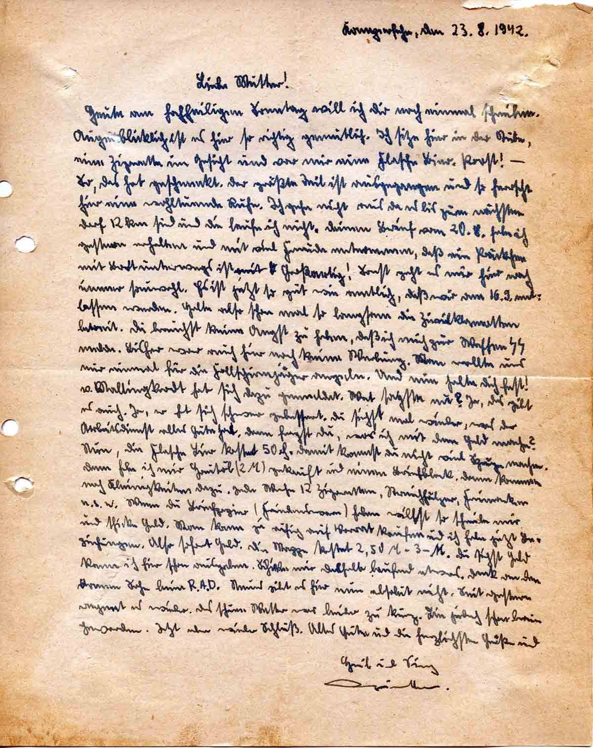 Heute, am hochheiligen Sonntag will ich Dir noch einmal schreiben. Augenblicklich ist es hier so richtig gemütlich. Ich sitze hier in der Stube, eine Zigarette im Gesicht und vor mir eine Flasche Bier. Prost! - So, das hat geschmeckt. Der größte Teil ist ausgegangen und so herrscht hier eine wohltuende Ruhe. Ich gehe nicht aus, da es bis zum nächsten Dorf 12 km sind, und die laufe ich nicht. Deinen Brief vom 20. 8. habe ich gestern erhalten, und mit viel Freude vernommen, daß ein Päckchen mit Brot unterwegs ist. Großartig! Sonst geht es mir hier noch immer sauwohl. Es ist jetzt so gut wie amtlich Daß wir am 16.9. entlassen werden. Halte also schon mal so langsam die Zivilklamotten bereit. Du brauchst keine Angst zu haben, daß ich mich zur Waffen-SS melde. Bisher war auch hier noch keine Werbung. Man wollte uns nur einmal für die Fallschirmjäger angeln. Und nun halte Dich fest! Von Mallingkrodt hat sich dazu gemeldet. Watt sagst nu? Ja, das gibt es auch. Ja, er hat sich schwer gebessert. Du sieh siehst mal wieder, was der Arbeitsdienst alles Gute hat. Dann fragst Du, was ich mit dem Geld mache? Nun, die Flasche Bier kostet 50 Pfennige. Damit kannst Du nicht viel Sprünge machen. Dann habe ich mir Hautöl (2 RM) gekauft und einen Briefblock. Dann kommen noch Kleinigkeiten dazu. Jede Woche 12 Zigaretten, Streichhölzer, Freimarken u.s.w. Wenn Du Briefpapier (Friedensware) haben willst, so schreibe mir und schicke Geld. Man kann ja ruhig auf Vorrat kaufen, und ich habe jetzt Beziehungen. Also, sofort Geld. Die Mappe kostet 2,50 bis 3,00 RM. Du siehst, Geld kann ich hier schon ausgeben. Schicke mir deshalb laufend etwas. Denke an Deinen armen Sohn beim RAD. Neues gibt es hier absolut nicht. Seit gestern regnet es wieder Das schöne Wetter war leider nur kurz. Bin jedoch schon braun geworden. Jetzt aber wieder Schluß. Alles Gute und die herzlichsten Grüße und