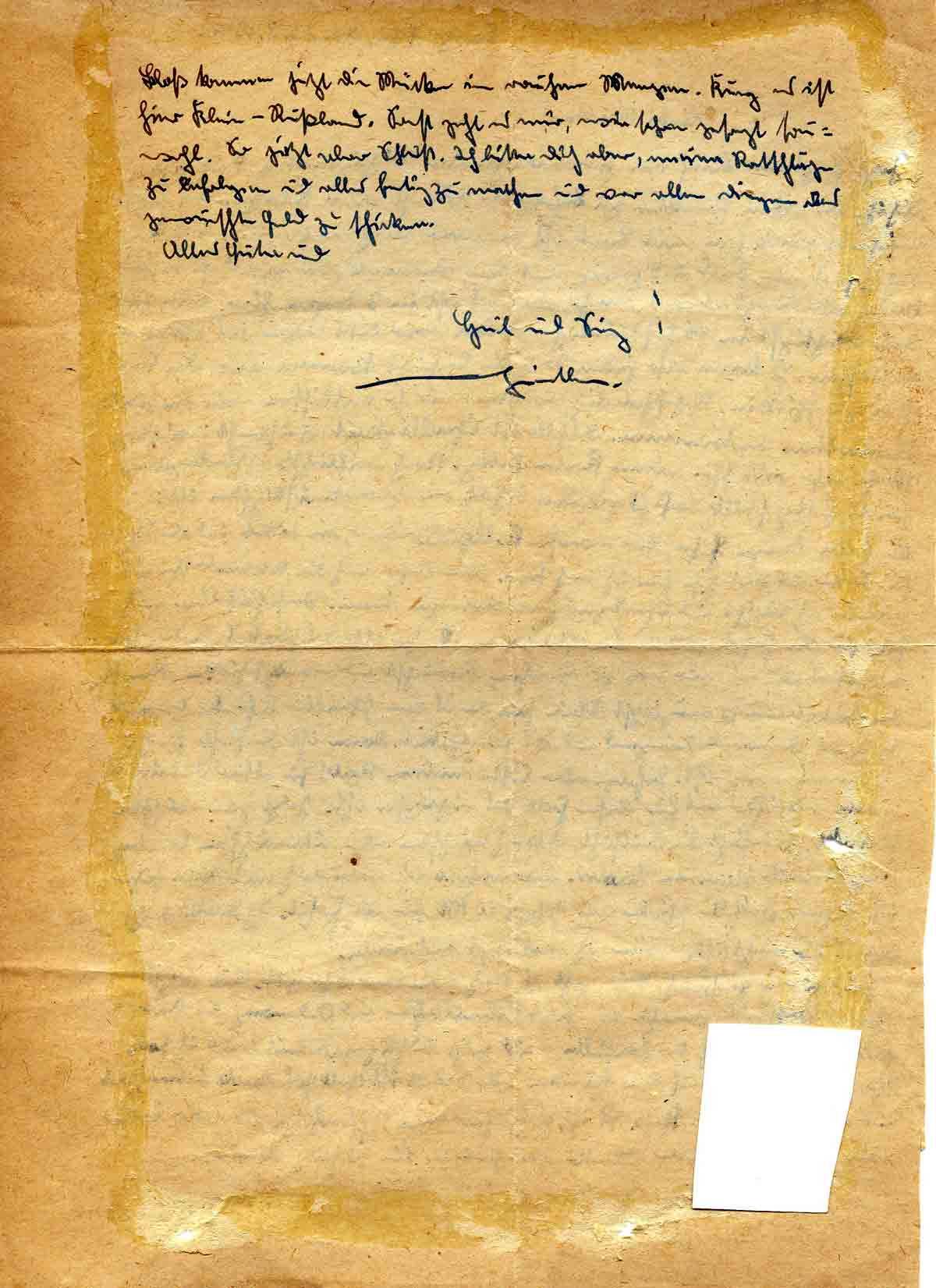 Bloß kommen jetzt die Mücken in rauhen Mengen. Kurz, es ist hier Klein-Rußland. Sonst geht es mir, wie schon gesagt, sauwohl. So, jetzt aber Schluß. Ich bitte Dich aber, meine Ratschläge zu befolgen und alles fertig zu machen, und vor allen Dingen, das gewünschte Geld zu schicken.