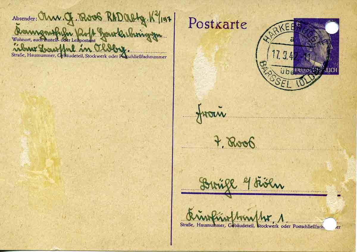 Sind nach einer tollen Himmelfahrt um 8 Uhr gestern Abend hier angekommen. Bis Osnabrück fuhren wir in unserem Galazug, und von hier gings mit dem Bummelzug bis Bremen. Bisher haben wir nur unsere Personalien angegeben, d.h. wir haben weder Stube noch Klamotten bekommen. Was aus mir wird, weiß ich noch nicht. Die Abiturienten, von über 150 Mann, wovon es mit mir nur 3 Mann, sind zur ersten Batterie gekommen. Was wir da machen werden, wissen wir noch nicht. Vorläufig heißt es abwarten. Eine Adresse habe ich bisher auch noch nicht. Sonst geht es mir aber noch sauwohl. Was macht Vater? Ist er noch auf Urlaub gekommen? Hast Du was Neues von Gustav gehört?