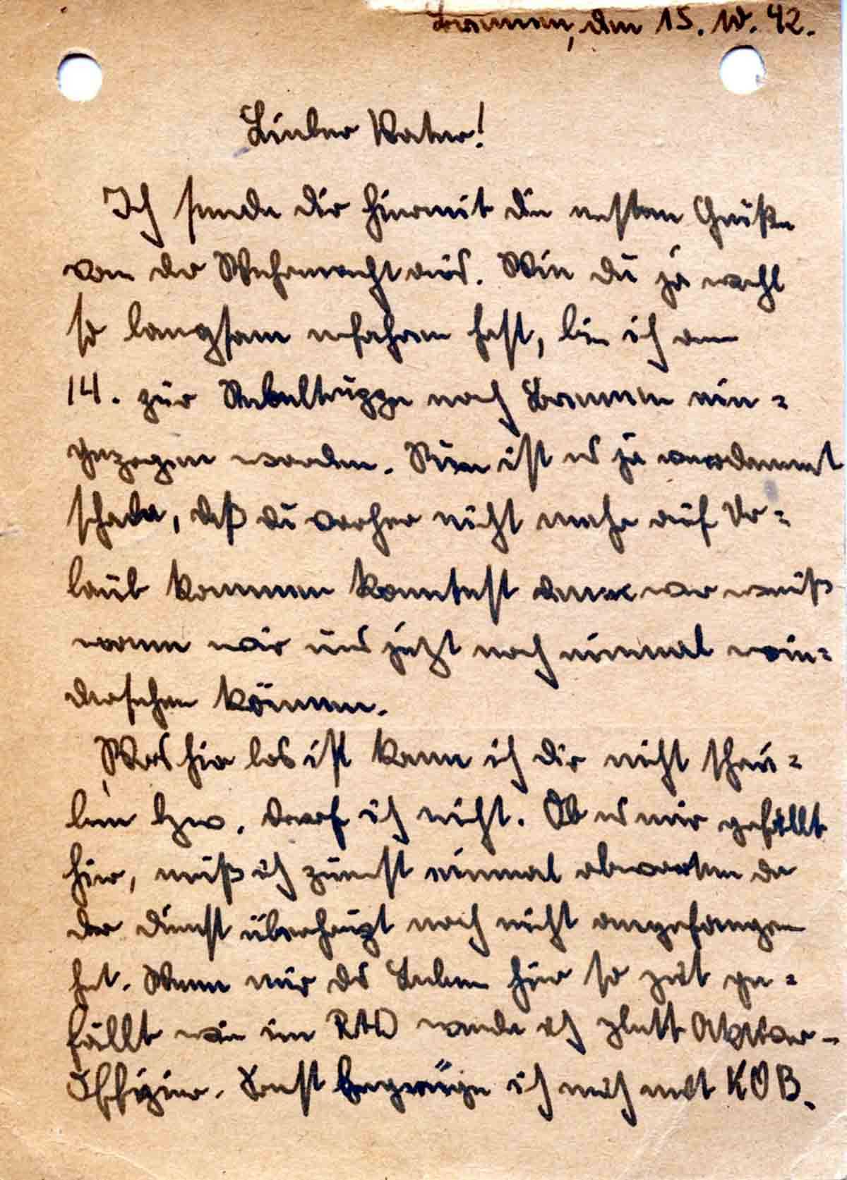 Ich sende Dir hiermit die ersten Grüße von der Wehrmacht aus. Wie Du ja wohl so langsam erfahren hast, bin ich am 14. zur Nebeltruppe nach Bremen eingezogen worden. Nun ist es ja verdammt schade, Daß Du vorher nicht mehr auf Urlaub kommen konntest, denn wer weiß, wann wir uns jetzt noch einmal Wiedersehen können.