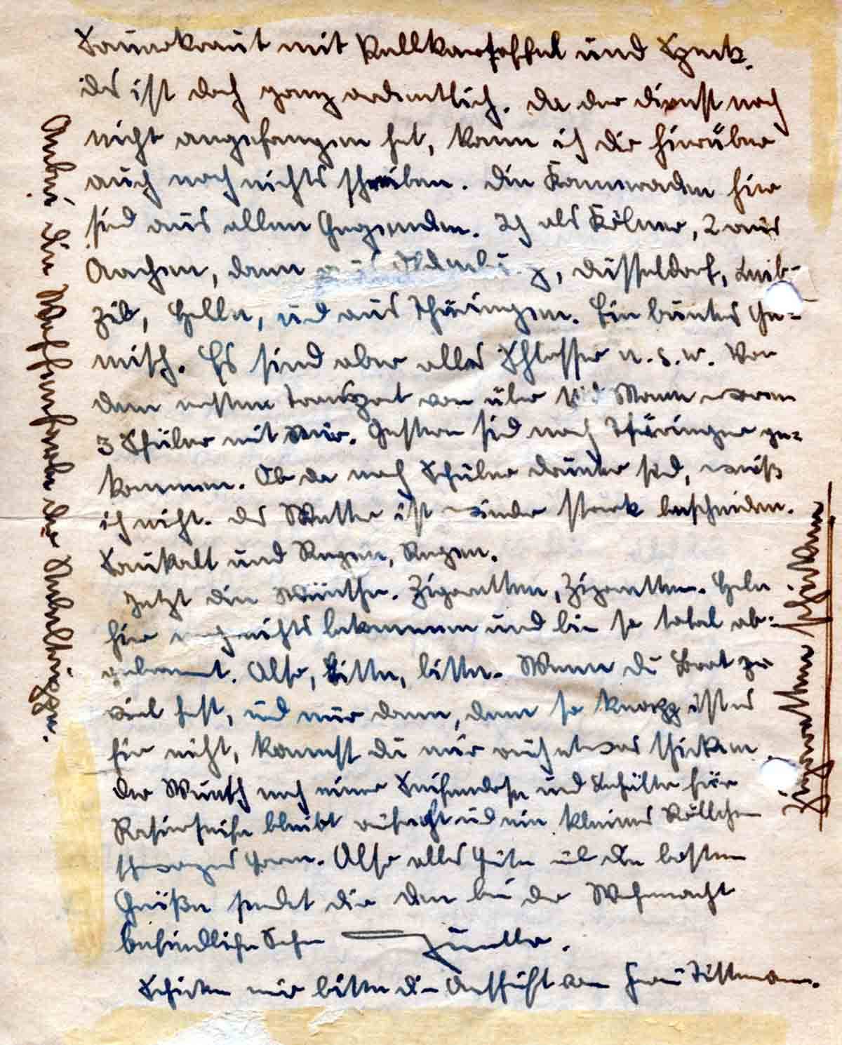 Jetzt Die Wünsche. Zigaretten, Zigaretten. Habe hier noch nichts bekommen und bin so total abgebrannt. Also, bitte, bitte. Wenn Du Brot zu viel hast, und nur dann, denn so knapp ist es hier nicht, kannst Du mir auch etwas schicken. Der Wunsch nach Seifendose und Behälter für Rasierseife bleibt aufrecht, und ein kleines Röllchen schwarzes Garn. Also alles Gute und die besten Grüße sendet Dir Dein bei der Wehrmacht befindlicher Sohn