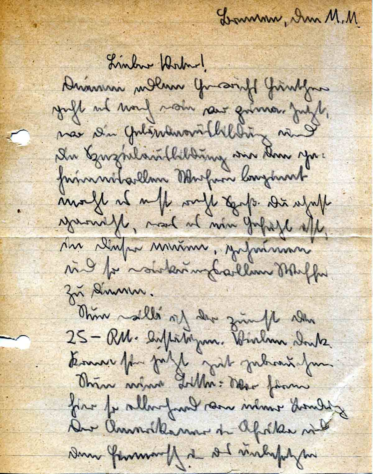 Nun will ich Dir zuerst die 25,-RM bestätigen. Vielen Dank. Kann sie jetzt gut gebrauchen.