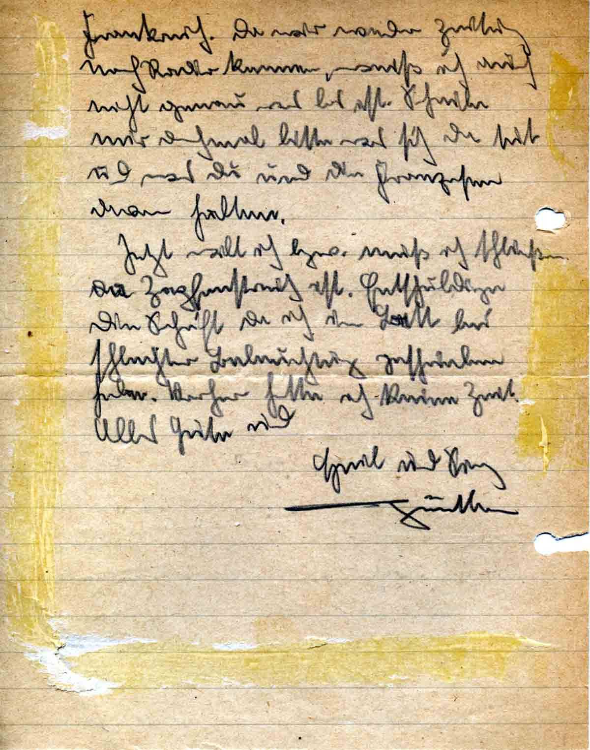 Jetzt will ich bzw. muß ich schließen, da Zapfenstreich ist. Entschuldige die Schrift, da ich im Bett bei schlechter Beleuchtung geschrieben habe. Vorher hatte ich keine Zeit.