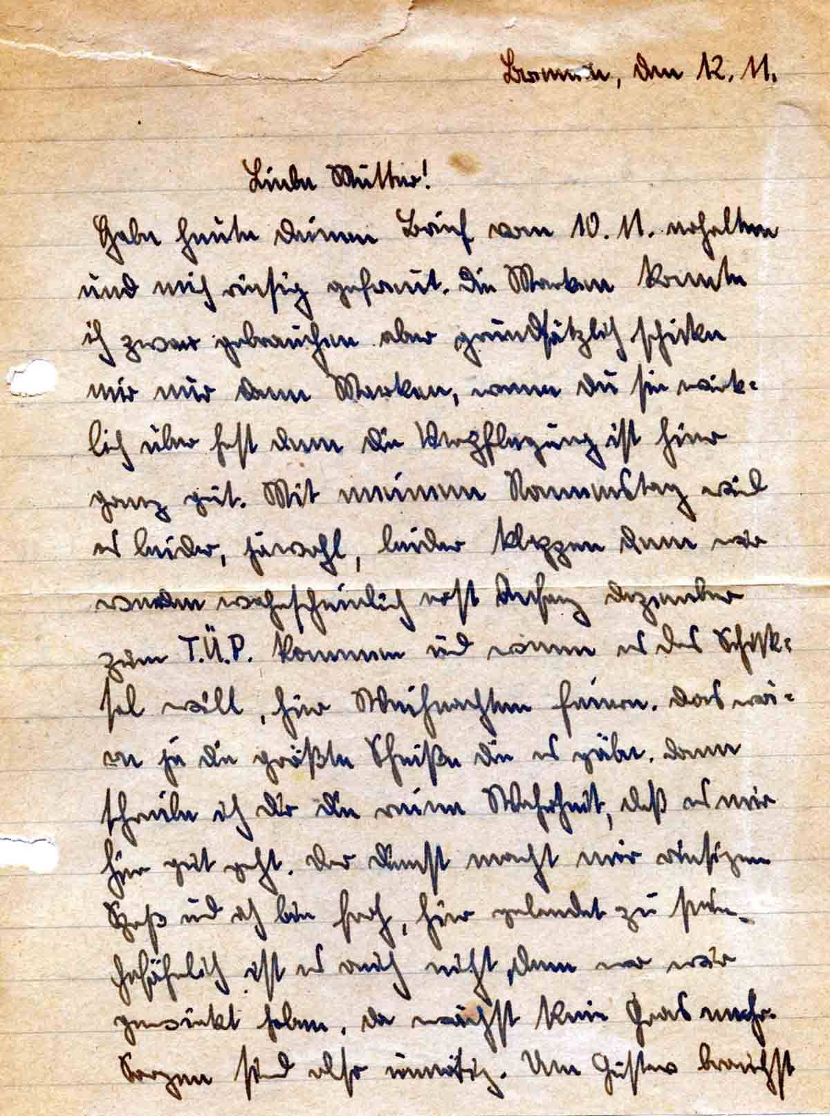 Habe heute Deinen Brief vom 10.11. erhalten und mich riesig gefreut. Die Marken konnte ich zwar gebrauchen, aber grundsätzlich schicke mir nur Marken, wenn Du sie wirklich über hast, denn die Verpflegung ist hier ganz gut. Mit meinem Namenstag wird es leider, jawohl, leider klappen, denn wir werden wahrscheinlich erst Anfang Dezember zum Truppenübungsplatz kommen, und wenn es das Schicksal will, hier Weihnachten feiern. Das wäre ja die größte Scheiße, die es gäbe. Dann schreibe ich Dir die reine Wahrheit, daß es mir hier gut geht. Der Dienst macht mir riesigen Spaß, und ich bin froh, hier gelandet zu sein. Gefährlich ist es auch nicht, denn wo wir gewirkt haben, da wächst kein Gras mehr. Sorgen sind also unnötig. Um Gustav brauchst