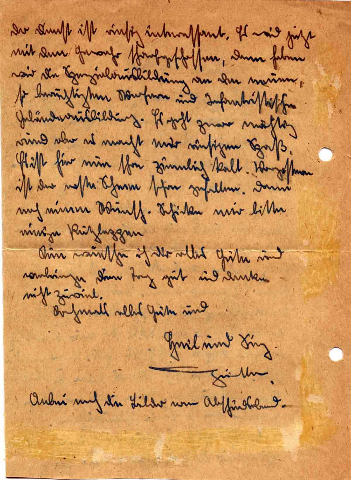 Der Dienst ist riesig interessant. Es wird jetzt mit dem Gewehr scharf geschossen. Dann haben wir die Spezialausbildung an den neuen, so berüchtigten Werfern und infantristische Geländeausbildung. Es geht zwar mächtig rund, aber es macht mir riesigen Spaß. Es ist nun hier schon ziemlich kalt. Vorgestern ist der erste Schnee gefallen. Dann noch ein Wunsch. Schicke mir bitte einige Putzlappen.