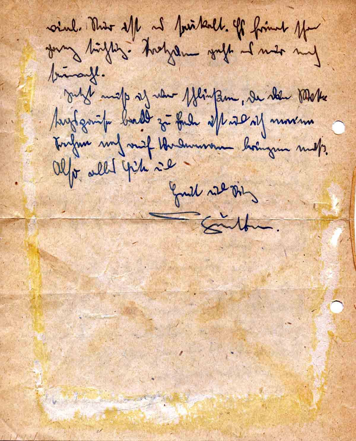 Ihr könnt Euch ja vorstellen, daß ich ziemlich erschüttert war, als ich hörte, daß Vater auf Urlaub sei. Habe sofort alles versucht, wenigstens Wochenendurlaub zu bekommen. Wäre beinahe geklappt. Da kam aber die Nachricht, daß Samstag Besichtigung durch den General ist, und so ist alles Scheiße. Schade!