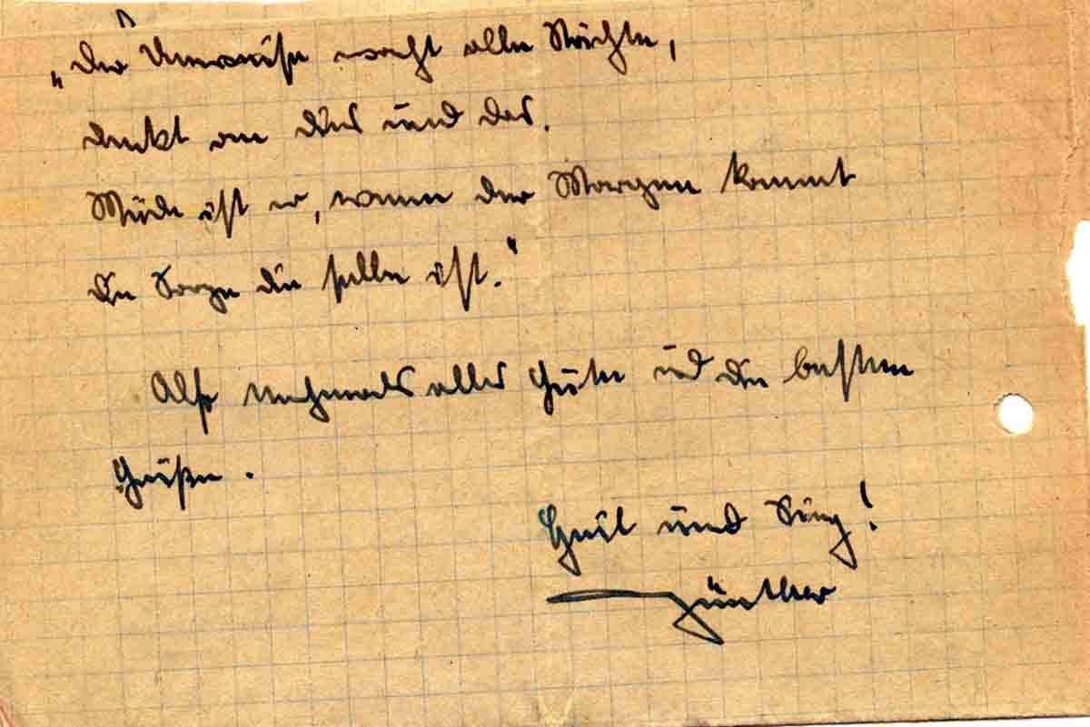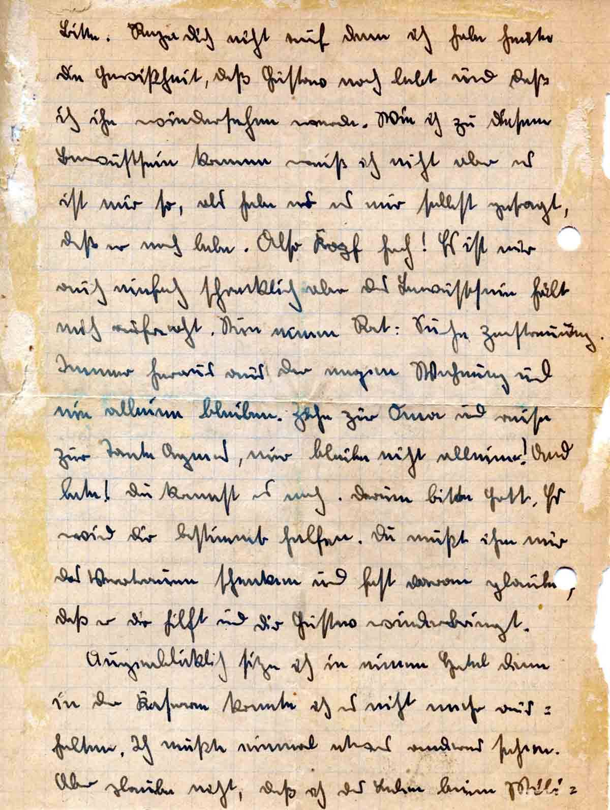 Bitte. Rege Dich nicht auf, denn ich habe heute die Gewißheit, daß Gustav noch lebt, und daß ich ihn wiedersehen werde. Wie ich zu diesem Bewußtsein komme, weiß ich nicht, aber es ist mir so, als habe er es mir selbst gesagt, daß er noch lebe. Also, Kopf hoch! Es ist mir auch einfach schrecklich, aber das Bewußtsein hält mich aufrecht. Nun ein Rat: Suche Zerstreuung. Immer heraus aus der engen Wohnung, und nie alleine bleiben. Ziehe zur Oma und reise zur Tante Agnes, nur bleibe nicht alleine! Und bete! Du kannst es noch. Darum bitte Gott.