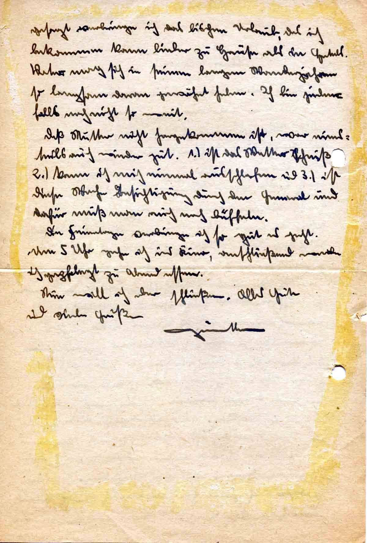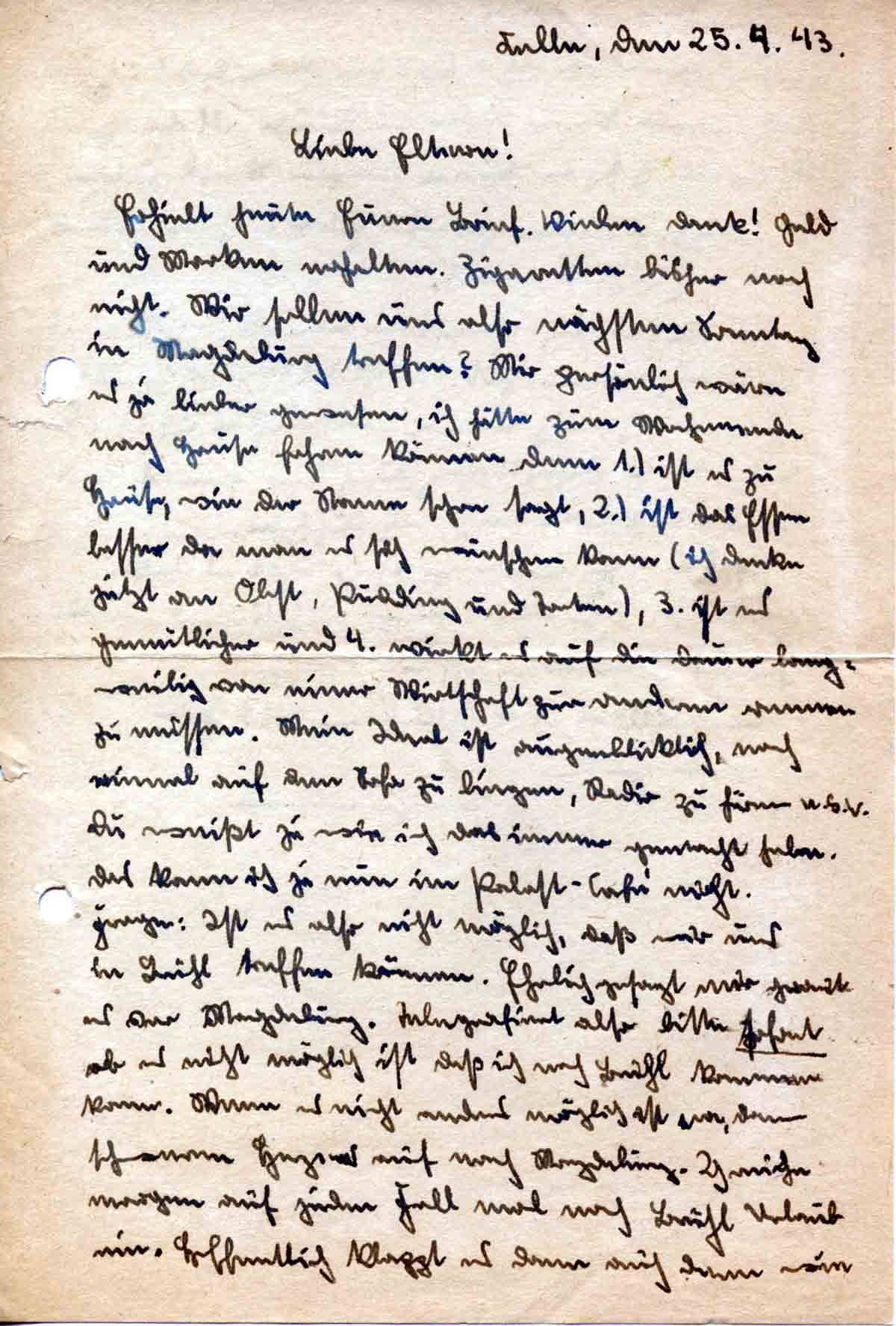 Erhielt heute Euren Brief. Vielen Dank! Geld und Marken erhalten. Zigaretten bisher noch nicht. Wir sollen uns also nächsten Sonntag in Magdeburg treffen? Mir persönlich wäre ja lieber gewesen/ ich hätte zum Wochenende nach Hause fahren können/ denn 1.) ist es zu Hause, wie schon der Name sagt 2.) ist das Essen besser, da man es sich wünschen kann (lch denke jetzt an Obst, Pudding und Torten) 3.) ist es gemütlicher und 4.) wirkt es auf die Dauer langweilig, von .einer Wirtschaft zur anderen rennen zu müssen. Mein Ideal ist augenblicklich noch einmal auf dem Sofa zu liegen, Radio zu hören usw. Du weißt ja, wie ich das immer gemacht habe. Das kann ich ja im Palast-Café nicht. Frage: Ist es also nicht möglich, daß wir uns in Brühl treffen können? Ehrlich gesagt, mir graut es vor Magdeburg. Telegraphiert bitte sofort, ob es nicht möglich ist, daß ich nach Brühl kommen kann. Wenn es nicht anders möglich ist, dann schweren Herzens auf nach Magdeburg. Ich reiche morgen auf jeden Fall mal nach Brühl Urlaub ein. Hoffentlich klappt es dann auch denn wie