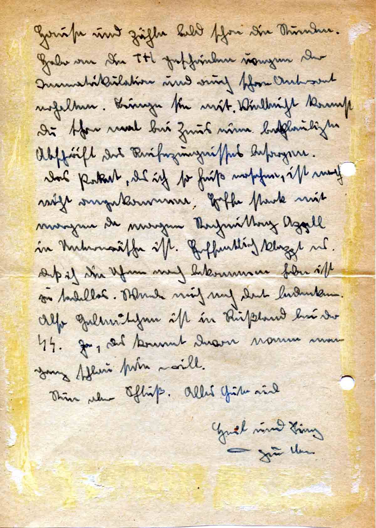 Das Paket, das ich so heiß ersehne, ist noch nicht angekommen. Hoffe stark mit morgen, da morgen Nachmittag Apell in Unterwäsche ist. Hoffentlich klappt es. Daß ich die Uhren noch bekommen habe, ist ja tadellos. Werde mich nach dort bedanken. Also Helmütchen ist in Rußland bei der SS. Ja, das kommt davon, wenn man ganz schlau sein will.