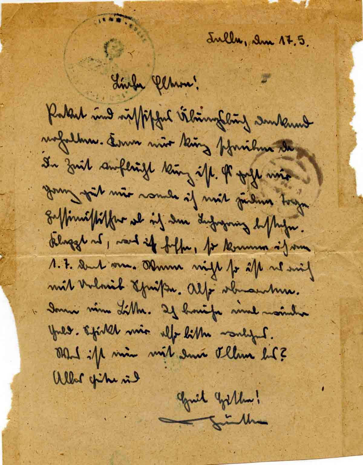 Günther Roos an seine Eltern, 17. Mai 1943