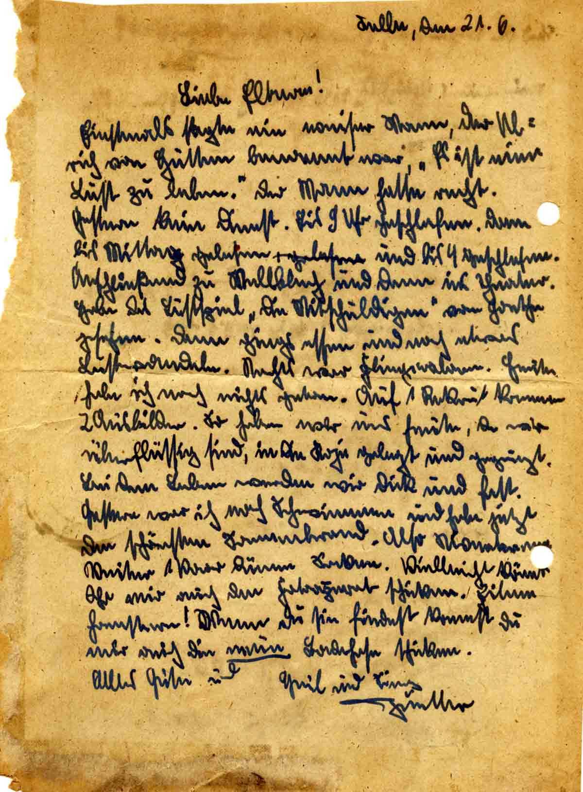Einstmals sagte ein weiser Mann, der Ulrich von Hutten benannt war, „Es ist eine Lust zu leben“. Der Mann hatte recht. Gestern kein Dienst. Bis 9 Uhr geschlafen. Dann bis Mittag gelesen und bis 4 Uhr geschlafen. Anschließend zu Wellblech und dann ins Theater. Haben das Lustspiel „Die Mitschuldigen“ von Goethe gesehen. Dann gings essen und noch etwas lustwandeln. Nachts war Fliegeralarm. Heute habe ich noch nichts getan. Auf einen Rekruten kommen zwei Ausbilder. So haben wir uns heute, da wir überflüssig sind, in die Koje gelegt und gegrunzt. Bei dem Leben werden wir dick und fett. Gestern war ich noch schwimmen, und habe jetzt den schönsten Sonnenbrand. Also Niveacreme. Weiter 1 Paar dünne Socken. Vielleicht könnt Ihr mir auch den Fotoapparat schicken. Filme hamstern! Wenn Du sie findest, kannst Du mir auch die neue Badehose schicken.