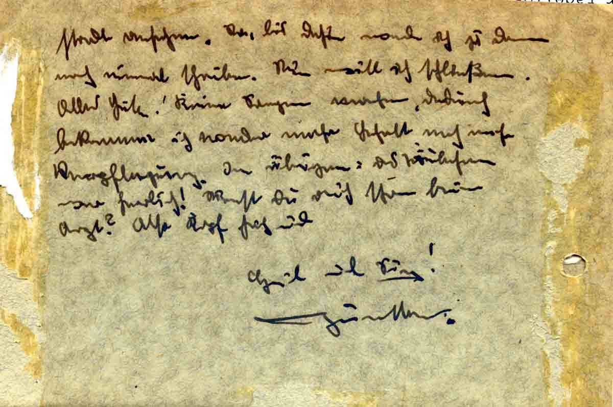 Wie Du siehst bin ich auf der Fahrt. Vorläufig noch in Deutschland. Es geht mir tadellos. Haben gestern unsere alten Klamotten abgegeben und neue Sachen empfangen. Sind von Kopf bis Fuß neu eingekleidet worden. 2 kleine Päckchen mit Sachen sind an Dich unterwegs. Gestern Abend waren wir noch mal bis 1 Uhr aus. Habe mir hier noch den Münchhausenfilm angesehen. Einfach herrlich.