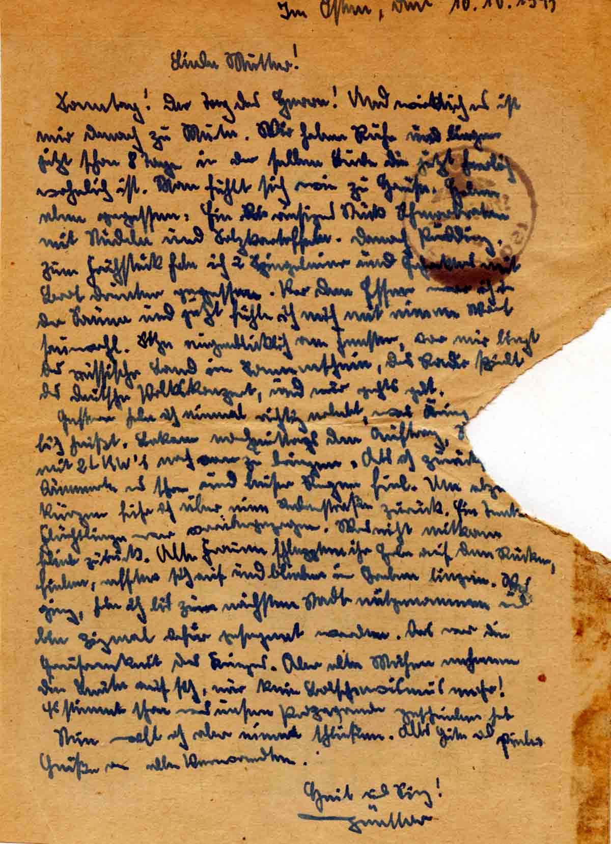 Günther Roos an Mutter Elisabeth, 10. Oktober 1943