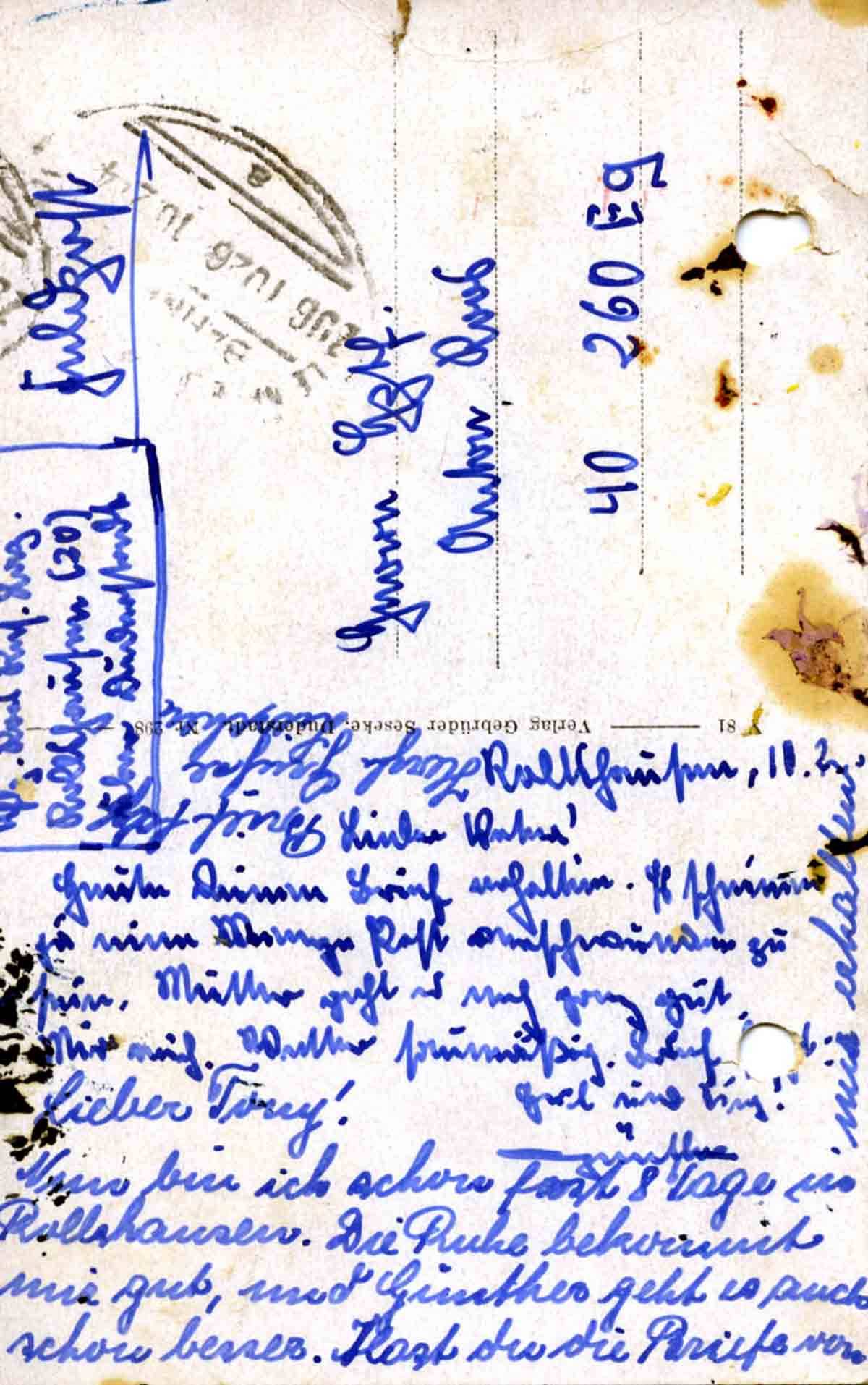 Heute Deinen Brief erhalten. Es scheinen ja eine Menge Post verschwunden zu sein. Mutter geht es noch ganz gut. Mir auch. Wetter saumäßig. Brief folgt.
