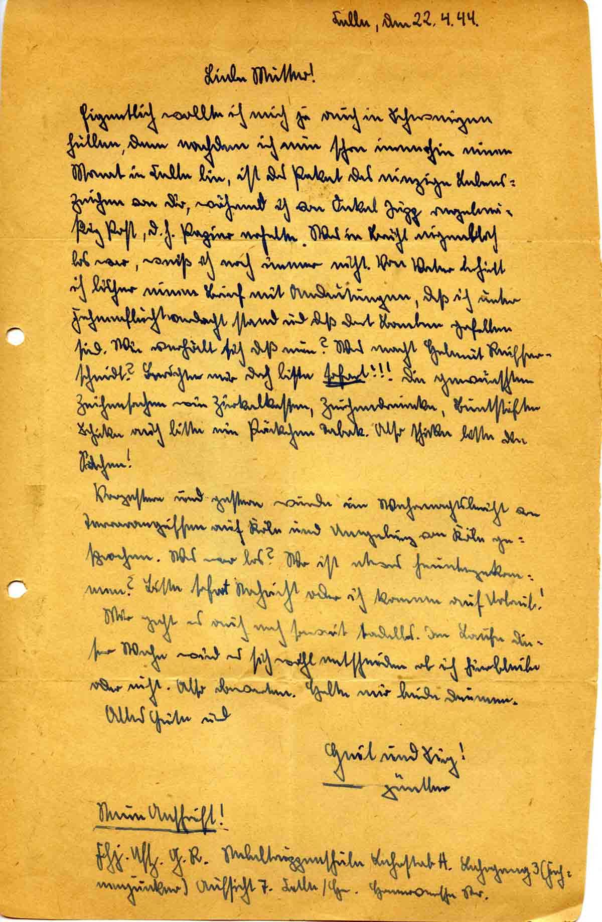 Günther Roos an Mutter Elisabeth, 22. April 1944