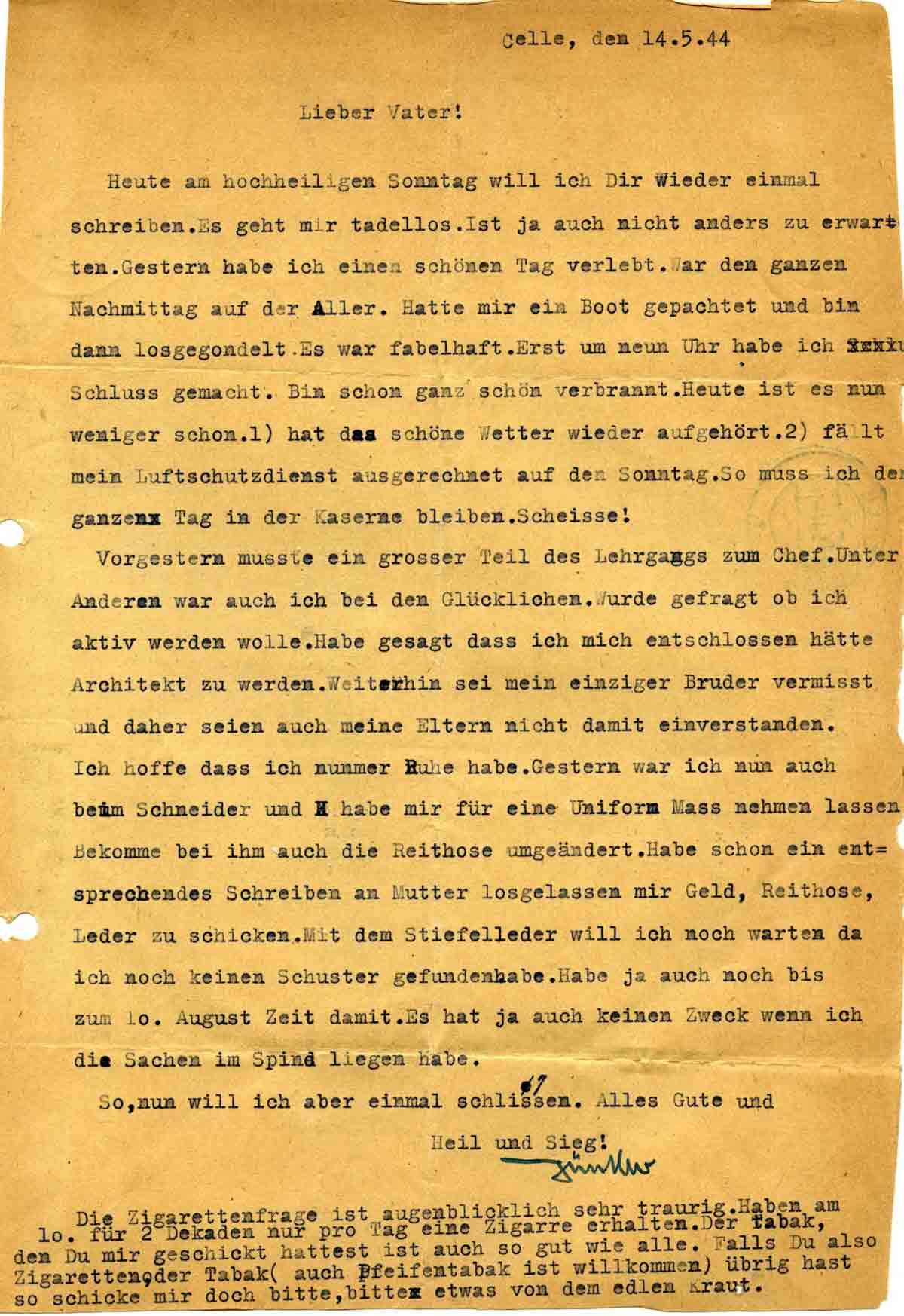 Heute am hochheiligen Sonntag will ich Dir wieder einmal schreiben. Es geht mir tadellos. Ist ja auch nicht anders zu erwarten. Gestern habe ich einen schönen Tag verlebt. War den ganzen Nachmittag auf der Aller. Hatte mir ein Boot gepachtet und bin dann losgegondelt .Es war fabelhaft .Erst um neun Uhr habe ich Schluss gemacht. Bin schon ganz schön verbrannt. Heute ist es nun weniger schön. 1) hat das schöne Wetter wieder aufgehört. 2) fällt mein Luftschutzdienst ausgerechnet auf den Sonntag. So muss ich den ganzen Tag in der Kaserne bleiben. Scheisse!