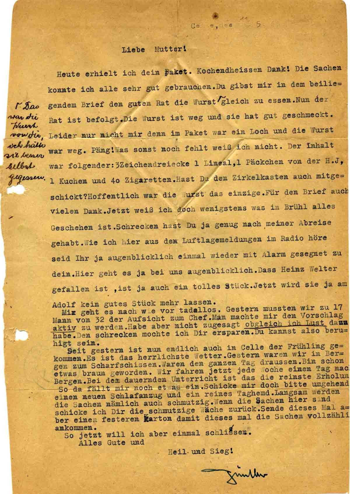 Heute erhielt ich dein Paket. Kochendheissen Dank! Die Sachen konnte ich alle sehr gut gebrauchen. Du gibst mir in dem beiliegendem Brief den guten Rat die Wurst [Anmerkung Elisabeth Roos: Das war die Wurst von (???), ich hätte sie besser selbst gegessen.] gleich zu essen .Nun der Rat ist befolgt .Die Wurst ist weg und sie hat gut geschmeckt. Leider nur nicht mir denn im Paket war ein Loch und die Wurst war weg. Päng! Was sonst noch fehlt weiß ich nicht. Der Inhalt war folgender: 3 Zeichendreiecke 1 Lineal, 1 Päckchen von der HJ, 1 Kuchen und 40 Zigaretten. Hast Du den Zirkelkasten auch mitgeschickt? Hoffentlich war die Wurst das einzige. Für den Brief auch vielen Dank. Jetzt weiß ich doch wenigstens was in Brühl alles Geschehen ist. Schrecken hast Du ja genug nach meiner Abreise gehabt. Wie ich hier aus den Luftlagemeldungen im Radio höre seid Ihr ja augenblicklich einmal wieder mit Alarm gesegnet zu sein. Hier geht es ja bei uns augenblicklich. Dass Heinz Welter gefallen ist, ist ja auch ein tolles Stück. Jetzt wird sie ja am Adolf kein gutes Stück mehr lassen.