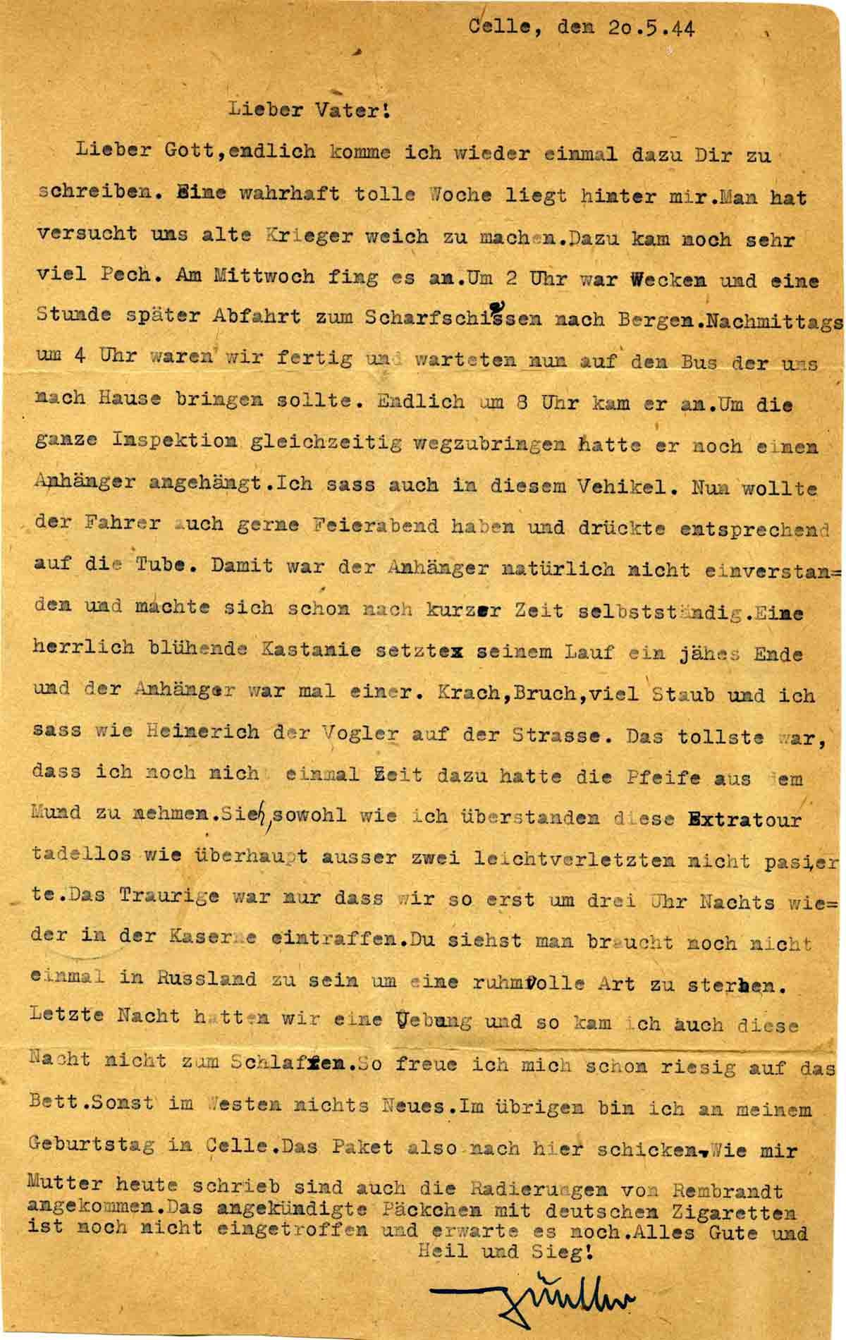Lieber Gott, endlich komme ich wieder einmal dazu Dir zu schreiben. Eine wahrhaft tolle Woche liegt hinter mir. Man hat versucht uns alte Krieger weich zu machen. Dazu kam noch sehr viel Pech. Am Mittwoch fing es an. Um 2 Uhr war Wecken und eine Stunde später Abfahrt zum Scharfschiessen nach Bergen. Nachmittags um 4 Uhr waren wir fertig und warteten nun auf den Bus der uns nach Hause bringen sollte. Endlich am 3 Uhr kam er an. Um die ganze Inspektion gleichseitig wegzubringen hatte er noch einen Anhänger angehängt. Ich sass auch in diesem Vehikel. Nun wollte der Fahrer auch gerne Feierabend haben und drückte entsprechen auf die Tube. Damit war der Anhänger natürlich nicht einverstanden und machte sich schon nach kurzer Zeit selbstständig .Eine herrlich blühende Kastanie setzte seinem Lauf ein jähes Ende und der Anhänger war mal einer. Krach, Bruch, viel Staub und ich sass wie Heinerich der Vogler auf der Strasse. Das tollste war, dass ich noch nicht einmal Seit dazu hatte die Pfeife aus dem Mund zu nehmen. Sie sowohl wie ich überstanden diese Extratour tadellos wie überhaupt ausser zwei Leichtverletzten nicht passierte. Das Traurige war nur dass wir so erst um drei Uhr Nachts wieder in der Kaserne eintrafen. Du siehst man braucht noch nicht einmal in Russland zu sein um eine ruhmvolle Art zu sterben. Letzte Nacht hatten wir eine Uebung und so kam ich auch diese Nacht nicht zum Schlafen. So freue ich mich schon riesig auf das Bett. Sonst im Westen nichts Neues. Im übrigen bin ich an meinem Geburtstag in Celle .Das Paket also nach hier schicken- Wie mir Mutter heute schrieb sind auch die Radierungen von Rembrandt angekommen. Das angekündigte Päckchen mit deutschen Zigaretten ist noch nicht eingetroffen und erwarte es noch. Alles Gute und
